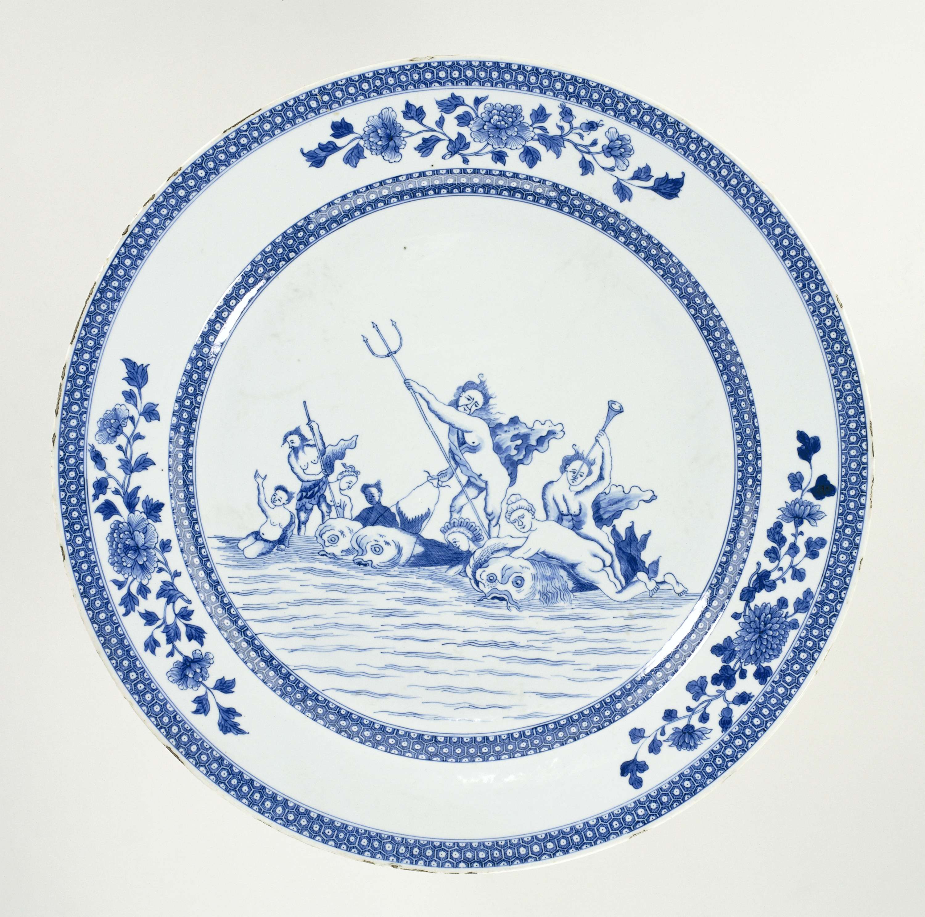 Bord op een voetring, met een platte rand. Gedecoreerd in onderglazuur blauw, met een voorstelling van Neptunus, de god van de zee, en meerminnen en meermannen. Op de rand drie bloemtakken. De voorstelling komt vanaf circa 1740 voor op porselein. Hoe populair dit onderwerp was blijkt uit een opdracht van de VOC directeuren uit 1778. Zij zonden een model van een chocoladekop met een soortgelijke voorstelling naar China zodat dit in productie kon worden genomen. De Nederlandse handelaren ter plaatse weigerden de opdracht echter, omdat Europese voorstellingen twee keer zo duur waren als Chinese voorstellingen. De voorstelling werd gemaakt naar een tekening van Frederick Bloemaert (1610-1669). Alleen onderglazuur blauwe exemplaren zijn bekend, wat opmerkelijk is. Deze werden in Jingdezhen geproduceerd en waren duurder dan de speciale bestellingen die in emailkleuren in Kanton werden geproduceerd. (Nederlands)
