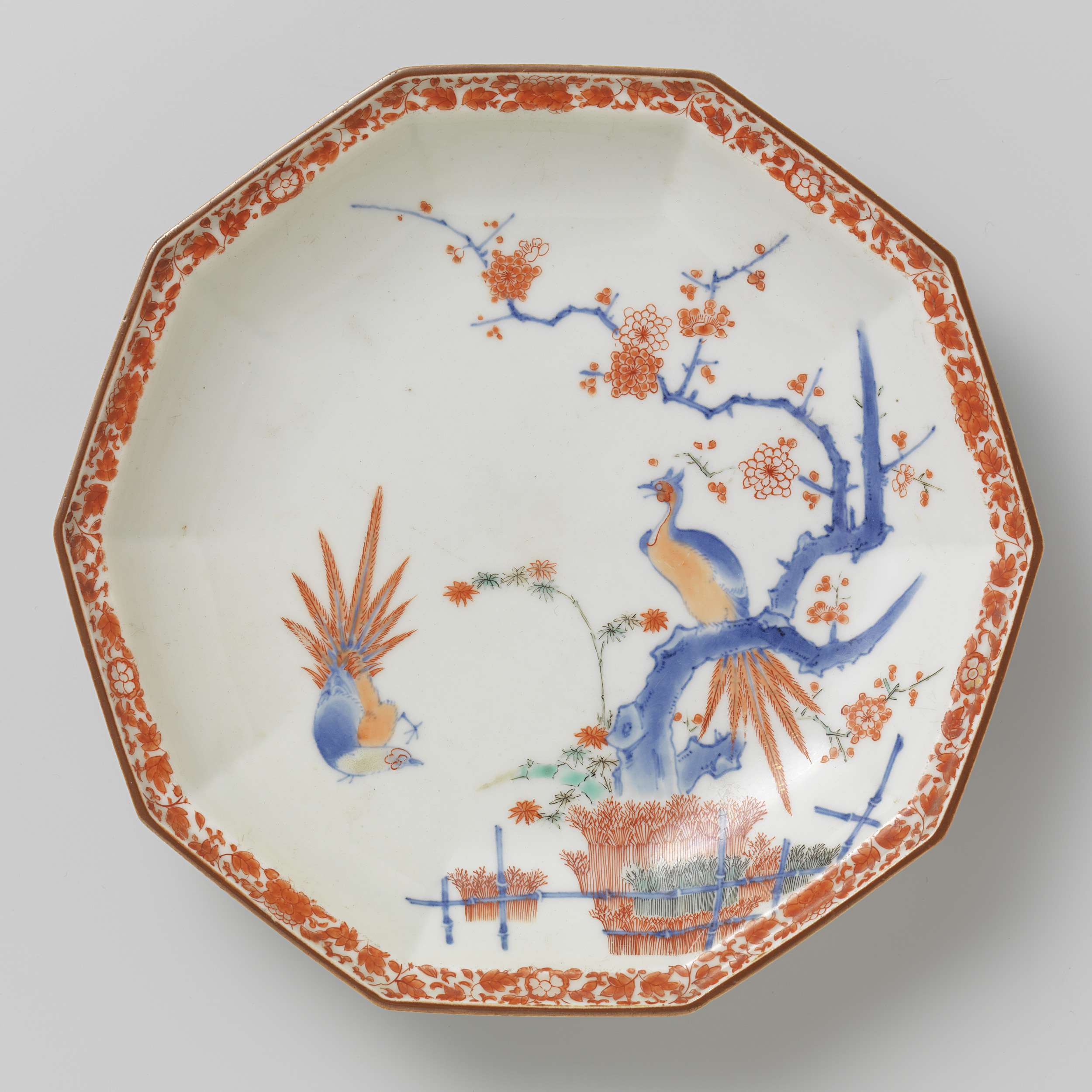 Tienhoekig bord van porselein, beschilderd in onderglazuur blauw en op het glazuur in rood, groen, geel, zwart en goud met bamboestengels en gebonden heggen bij een bloeiende prunusboom waarin een fazant zit, met links bamboe en nog een fazant, langs de bruine rand een band van blad- en bloemmotieven, op de achterkant doorlopende bladranken. Drie proenen en een merk van een ongeïdentificeerd karakter in de voetring. Kakiemon. (Nederlands)