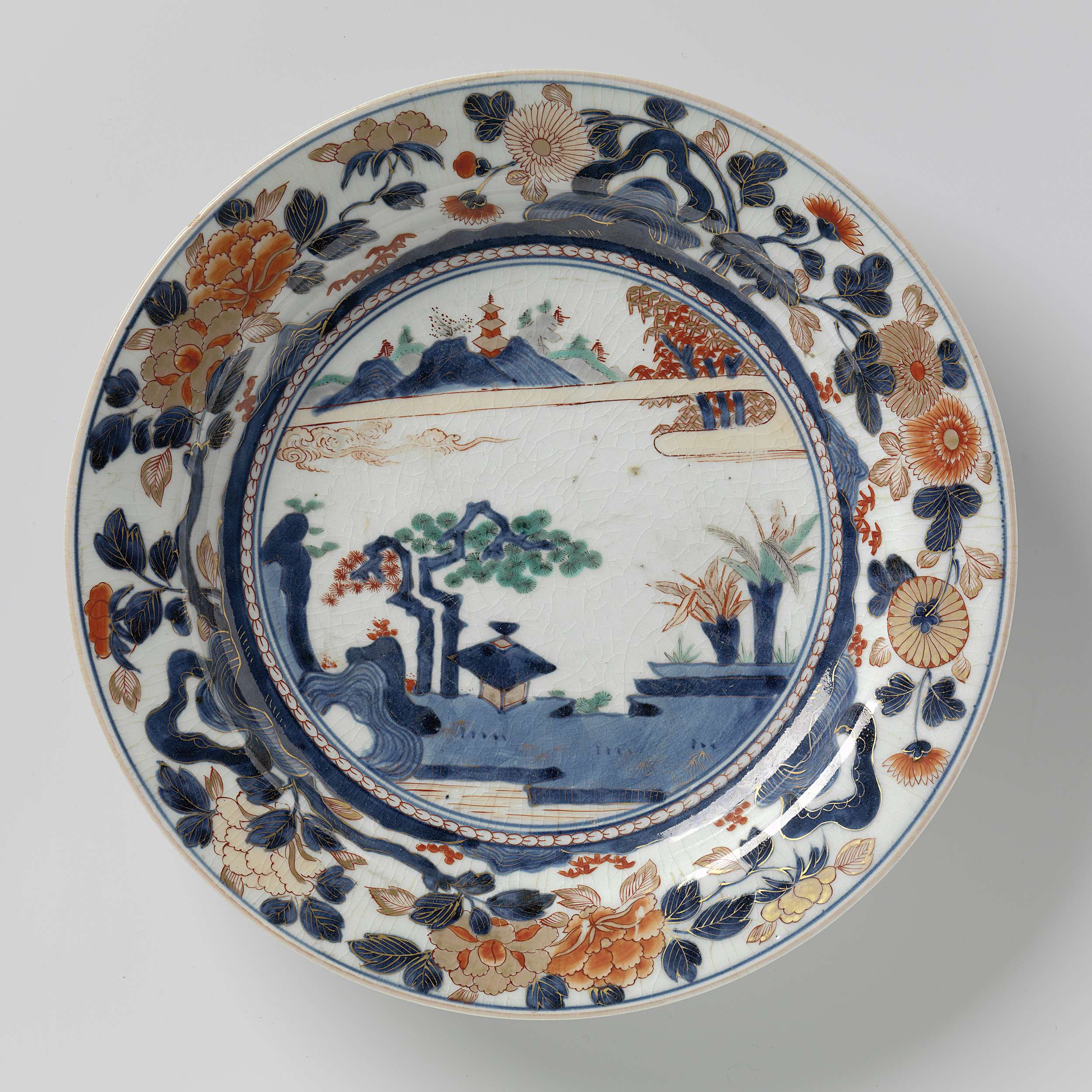 Schotel van porselein, beschilderd in onderglazuur blauw en op het glazuur rood, groen, aubergine en goud. Op het plat een medaillon met een rivierlandschap met bergen, rotsen, paviljoens, een pijnboom, twee potten met varens en wolken. Om het medaillon een smalle decoratieve band. De wand en de rand met twee bloemgroepen (chrysant en pioen) bij rotsen. De buitenwand met drie pioentakken. Vijf proenen op de onderzijde. Imari. (Nederlands)