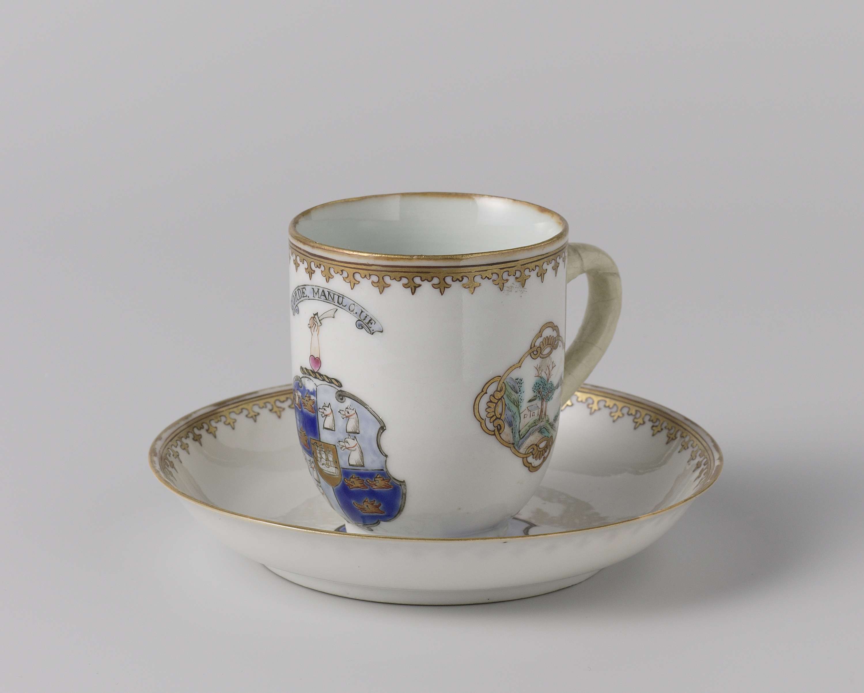 Oorkop en schotel van porselein, beschilderd op het glazuur in blauw, rood, roze, groen, geel, zwart en goud. Op het plat van de schotel het wapen van de families Gordon en Forbes. Het wapen is verdeeld in vier vakken met Gordon in 1. en 4. met drie zwijnenkoppen tegen een blauwe achtergrond; 2. en 3. Forbes met drie koppen op een lichtblauwe achtergrond. Het helmteken is een arm met een zwaard en het opschrift 'CORDE MANUQUE'. Op de binnenrand een spearhead-border. De kop met dezelfde decoratie met aan weerszijden van het wapen een cartouche met een landschap. Oor is afgebroken geweest. Wapenporselein met emailkleuren. (Nederlands)