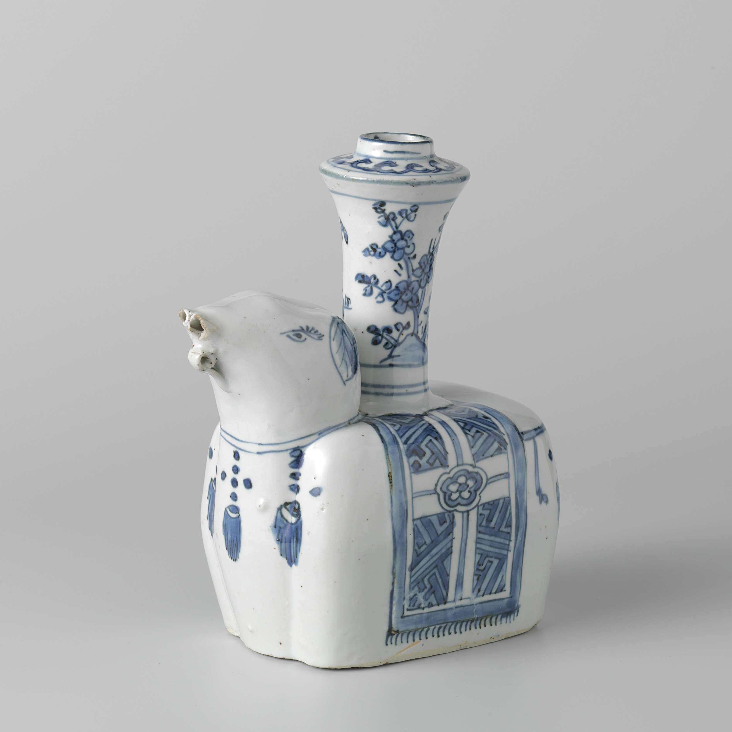 Kendi in de vorm van een olifant, versierd in onderglazuur blauw. Op de rug een kleed met geometrische motieven, op het handvat een bloeiende prunustak. (Nederlands)