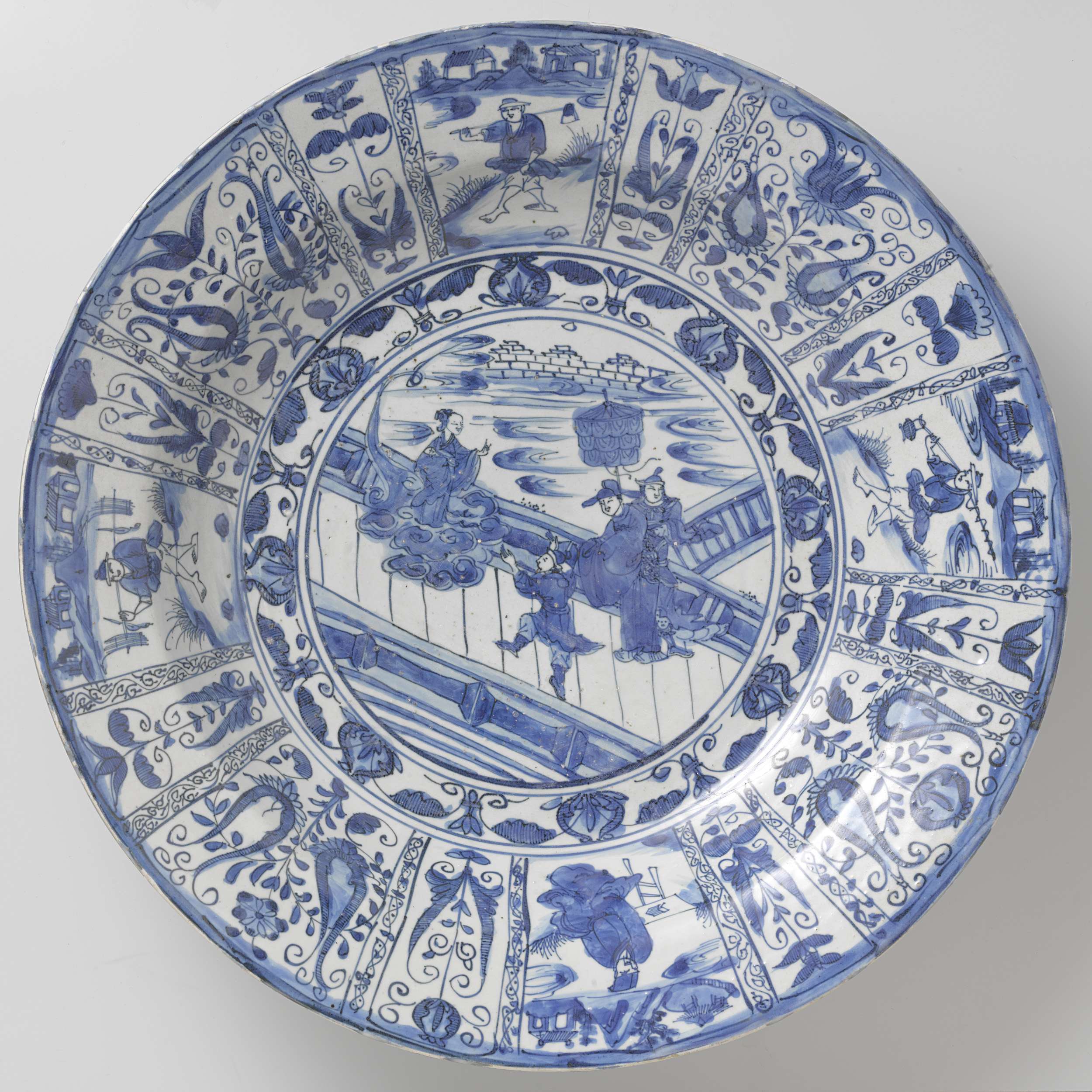 Schotel van porselein, beschilderd in onderglazuur blauw. Op het plat in een dubbel medaillon een voorstelling van een ontmoeting van een man, krijger en bediende met een hemelse vrouw, zwevend op een wolk. De drie mannen staan op een onheind terras bij water. Om het medaillon een band met bloemranken. De wand en rand zijn verdeeld in vakken met verschillende mannen in een landschap afgewisseld met gestileerde tulpmotieven. De achterzijde met een vakdecoratie. In de brede vakken cartouches met bloemranken, daartussen een smal vak met een bamboetak. Oud label op de onderzijde met 'A.J. Spijer & Zoon Amsterdam/ Antiquaires'. Kraakporselein. (Nederlands)