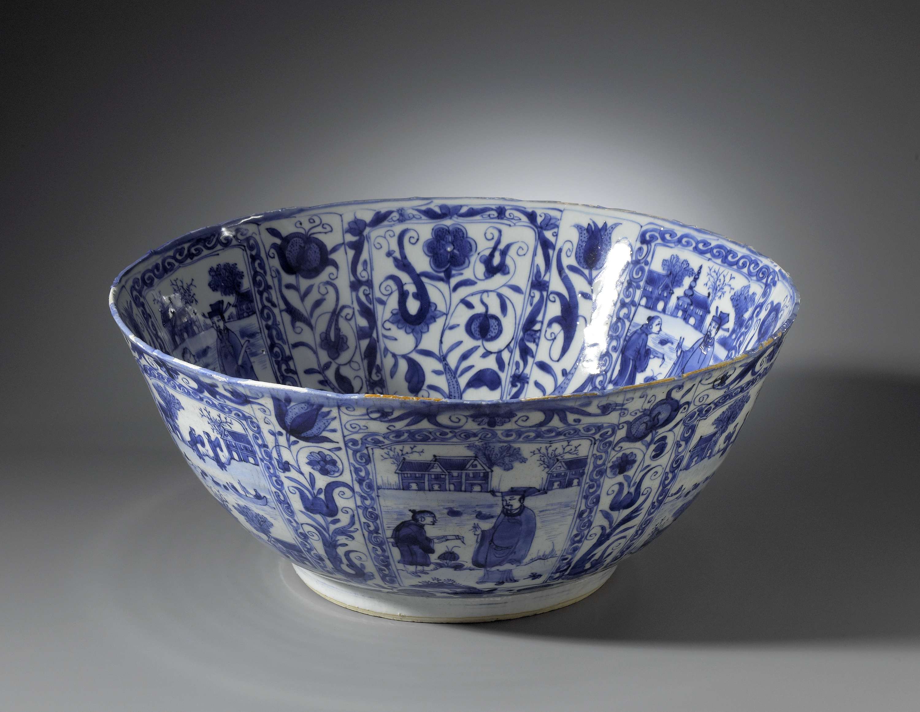 Kom van porselein met een accoladevormige rand, beschilderd in onderglazuur blauw. De buitenwand is verdeeld in brede en smalle vakken. In de brede vakken Chinese personen in landschappen met huizen en bomen die Europees aandoen. Om de vakken een band met krulwerk en aan de bovenzijde een bloemrank. De smalle vakken met een gestileerde bloem; boven de voet een band met bloemranken. Op de bodem een Chinese vrouw die in een interieur aan het spinnen is. De binnenwand met een vergelijkbare decoratie als de buitenwand alleen zijn de brede vakken afwisselend gevuld met het landschap of een bloemrank. Kraakporselein in blauw-wit. (Nederlands)