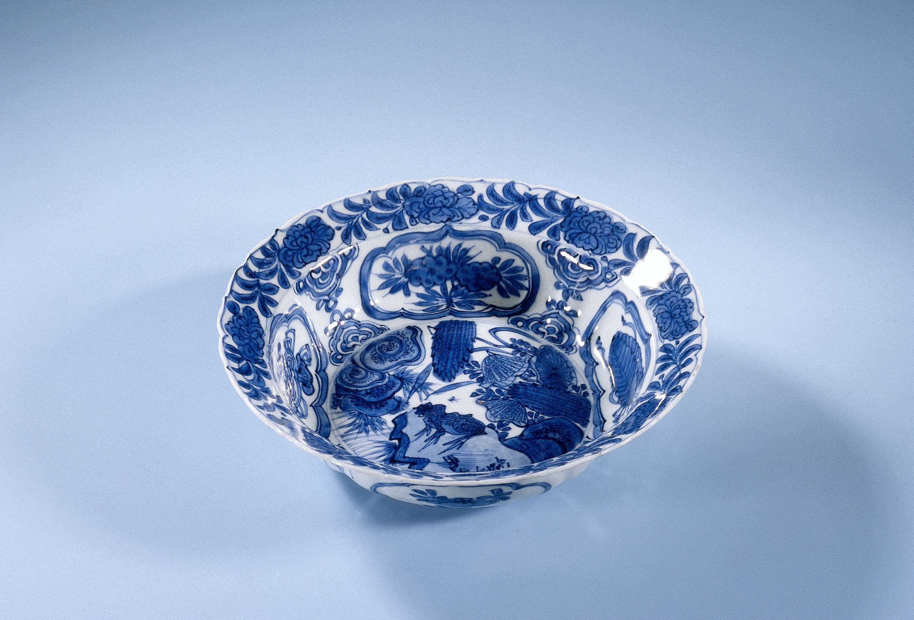 Klapmuts kom van porselein, beschilderd in onderglazuur blauw. Op de bodem een kikker op een rots tussen bloeiende planten in een rivierlandschap. De wand met vier geschulpte vakken met een bloemtak, kostbaarheden (artemisiablad), perziktak of een paddenstoel (lingzhi) gescheiden door ruyi-motieven. De binnenrand met een pioenrank. De buitenwand is verdeeld in brede en smalle vakken. De brede vakken met een geschulpt cartouche met perziktakken, de smalle vakken met een paddenstoel. Op de buitenrand twee prunustakken. Kraakporselein in blauw-wit. (Nederlands)