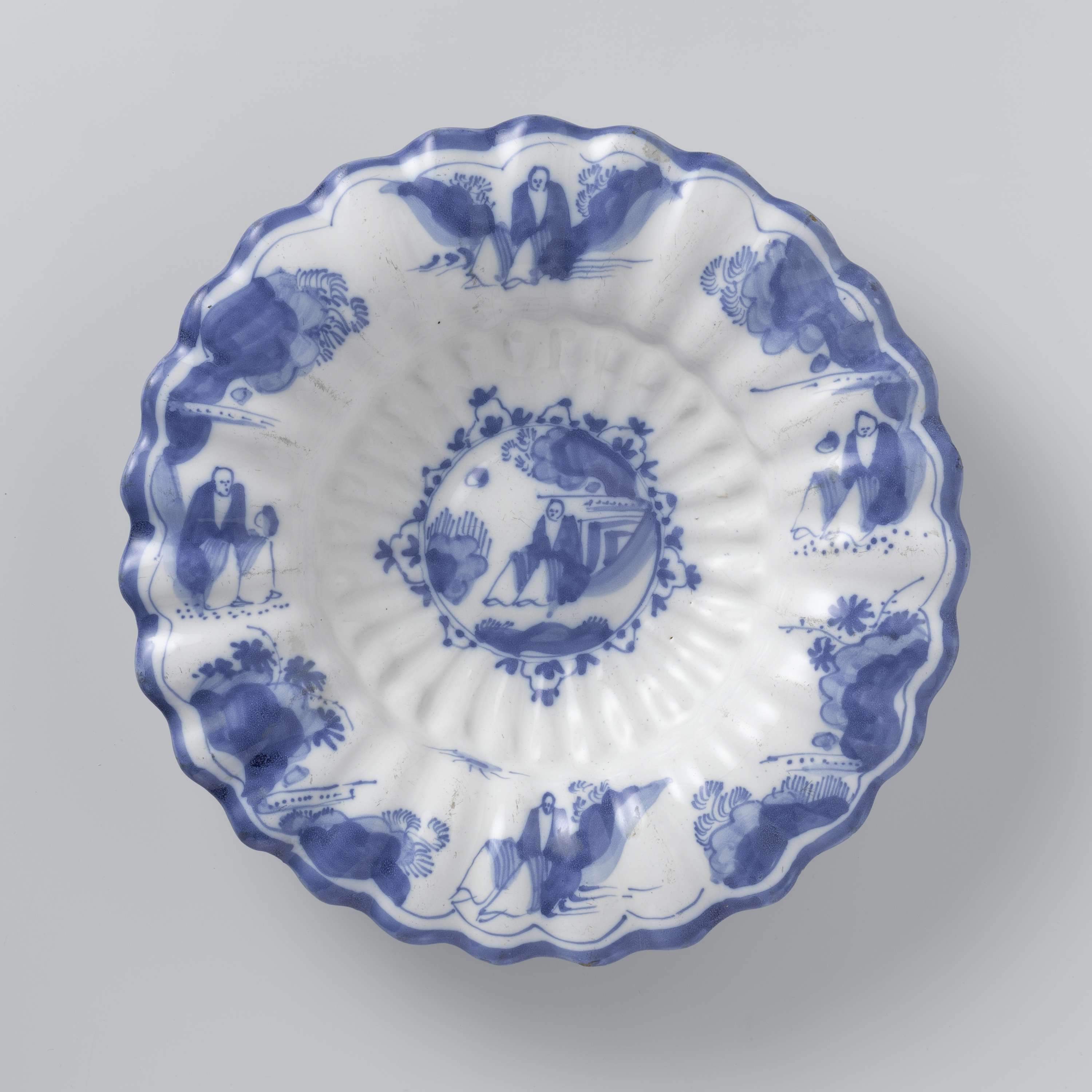 Ronde plooischotel van blauw beschilderde faience. Het plat heeft een bolle cirkel, waarop een zittende figuur is geschilderd. De rand is geribd en geschulpt en beschilderd met vier zittende figuren. (Nederlands)