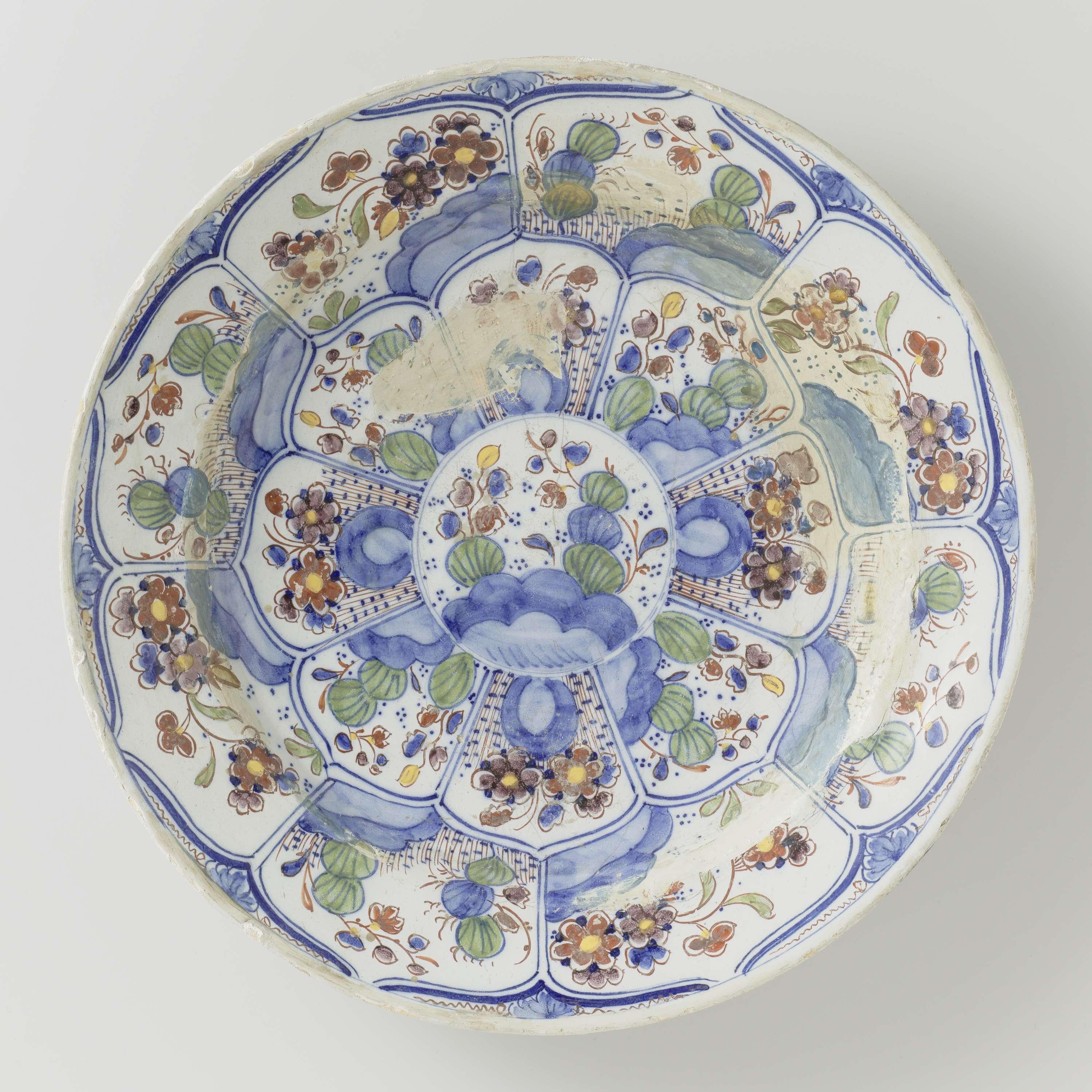 Ronde schotel van veelkleurig beschilderde faience. Op het plat is een cirkel met daarbinnen planten op een grond geschilderd, daar omheen acht vakken met planten en bloemen. De rand is verdeeld in acht vakken waarbinnen planten en bloemen. De gebruikte kleuren zijn: blauw, groen, rood, paars en geel. Bij de schotel horen vijf identieke schotels met invnrs. BK-NM-13347-a, BK-NM-133347-b, BK-NM-13347-c, BK-NM-13347-e, BK-NM-13347-f. De schotel is gemerkt. De glazuur geheel losgelaten. (Nederlands)