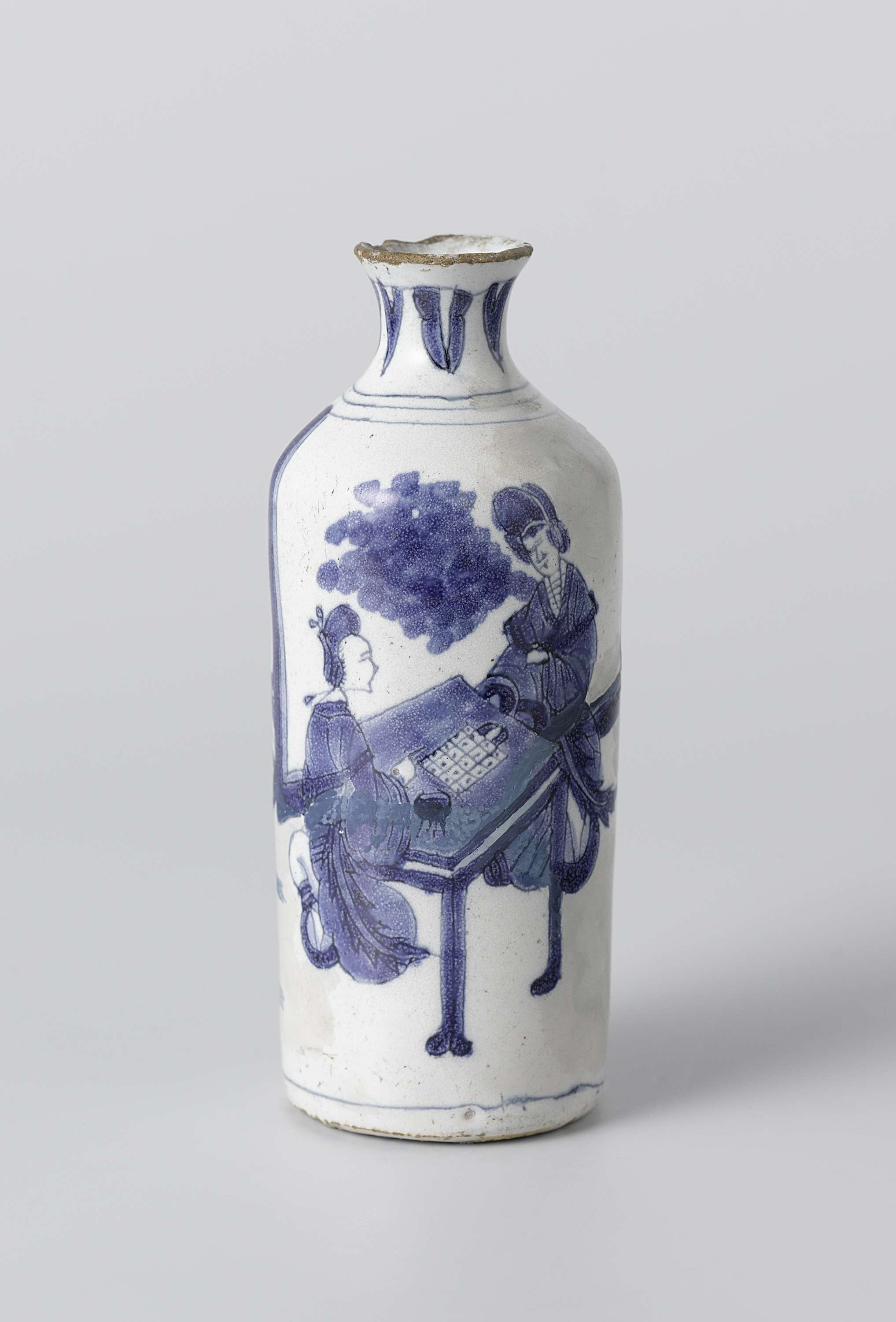 Rolwagen van faience. Blauw beschilderd met twee go-spelende Chinese vrouwen. (Nederlands)