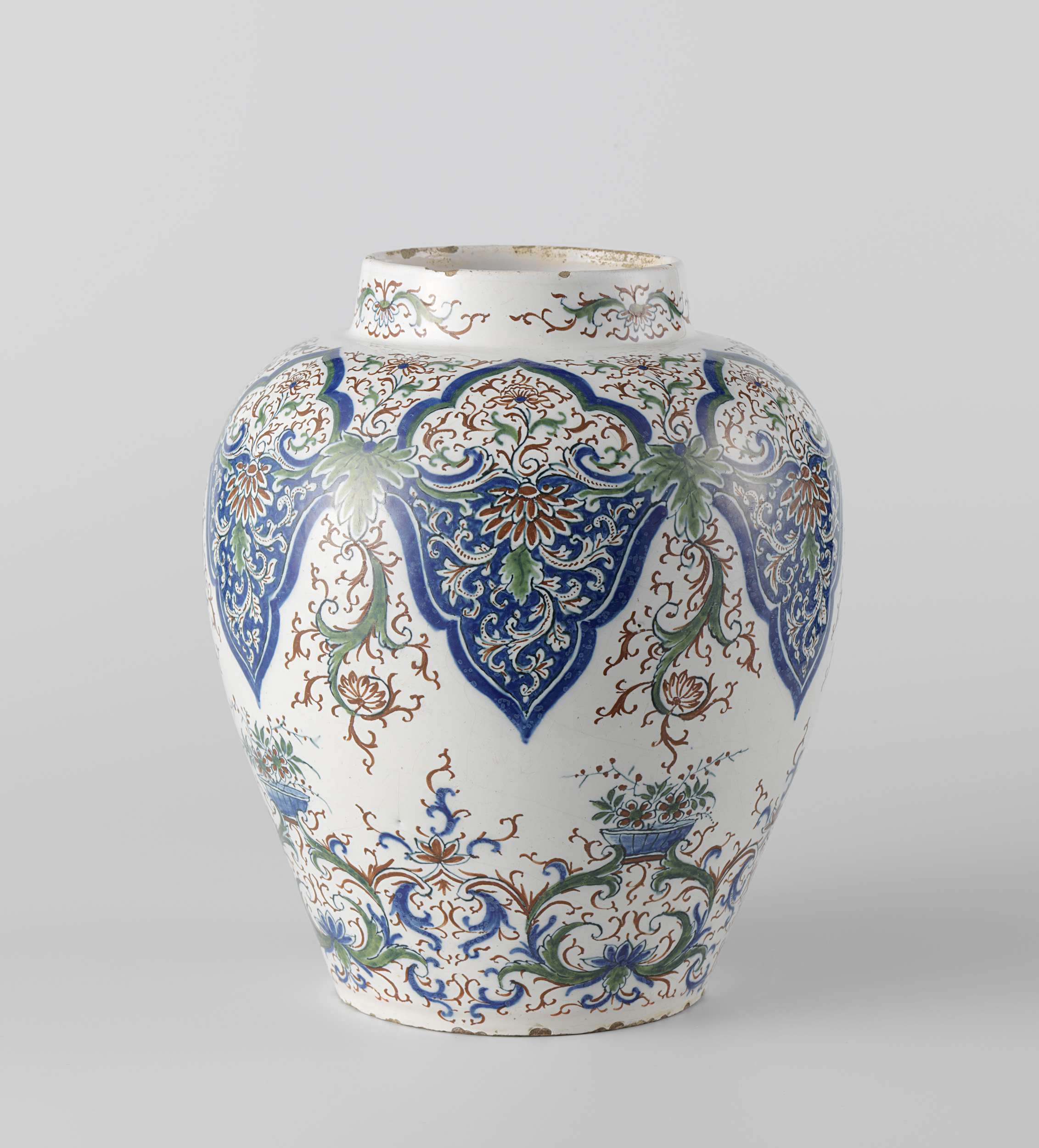 Vaas van faience. Veelkleurig beschilderd met lambrequins en bloemdecoraties. (Nederlands)
