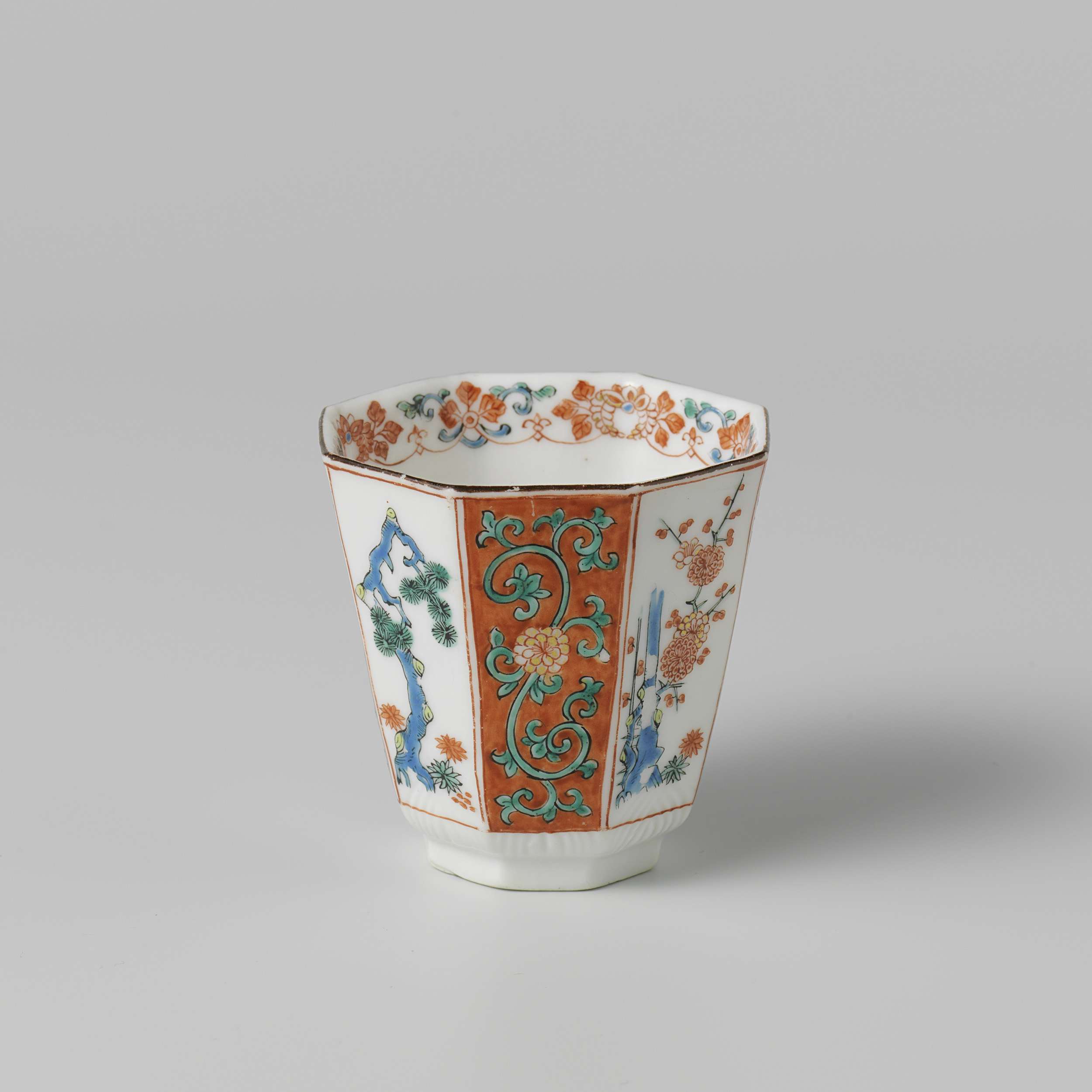 Achthoekige kop van porselein, bedekt met een doorschijnend glazuur en beschilderd op het glazuur in blauw, rood, groen, geel, zwart en goud. Boven de voet een band met ingegrifte, puntige bladmotieven. In Europa beschilderd met afwisselend bloeiende planten (pijnboom, bamboe, prunus[?]) of bloemranken tegen een rode achtergrond. Op de bodem een bloem; de binnenrand met bloemranken in Europese stijl. Gemerkt op de onderzijde met een zegelmerk. Bakzand aan de voetring. Blanc de Chine in Europa gedecoreerd in de Japanse Kakiemon-stijl. (Nederlands)