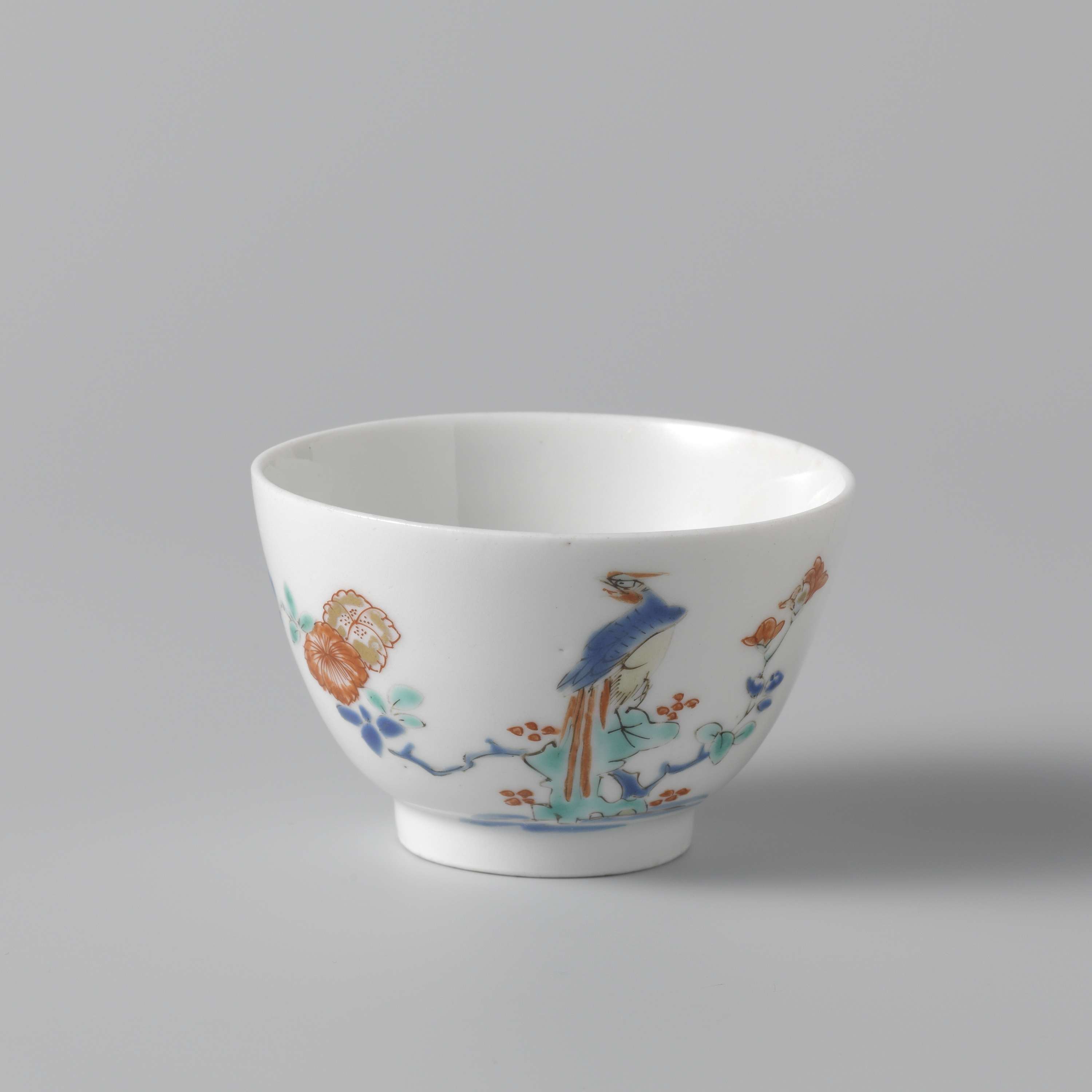 Ronde kop van porselein, beschilderd op het glazuur in blauw, rood, groen, geel, zwart en goud met een een paar hoo-vogels, een in de lucht en een op een rots met een bloemtak. Binnen op de bodem een rozet binnen een dubbele cirkel in rood en goud. Kakiemon-stijl. (Nederlands)