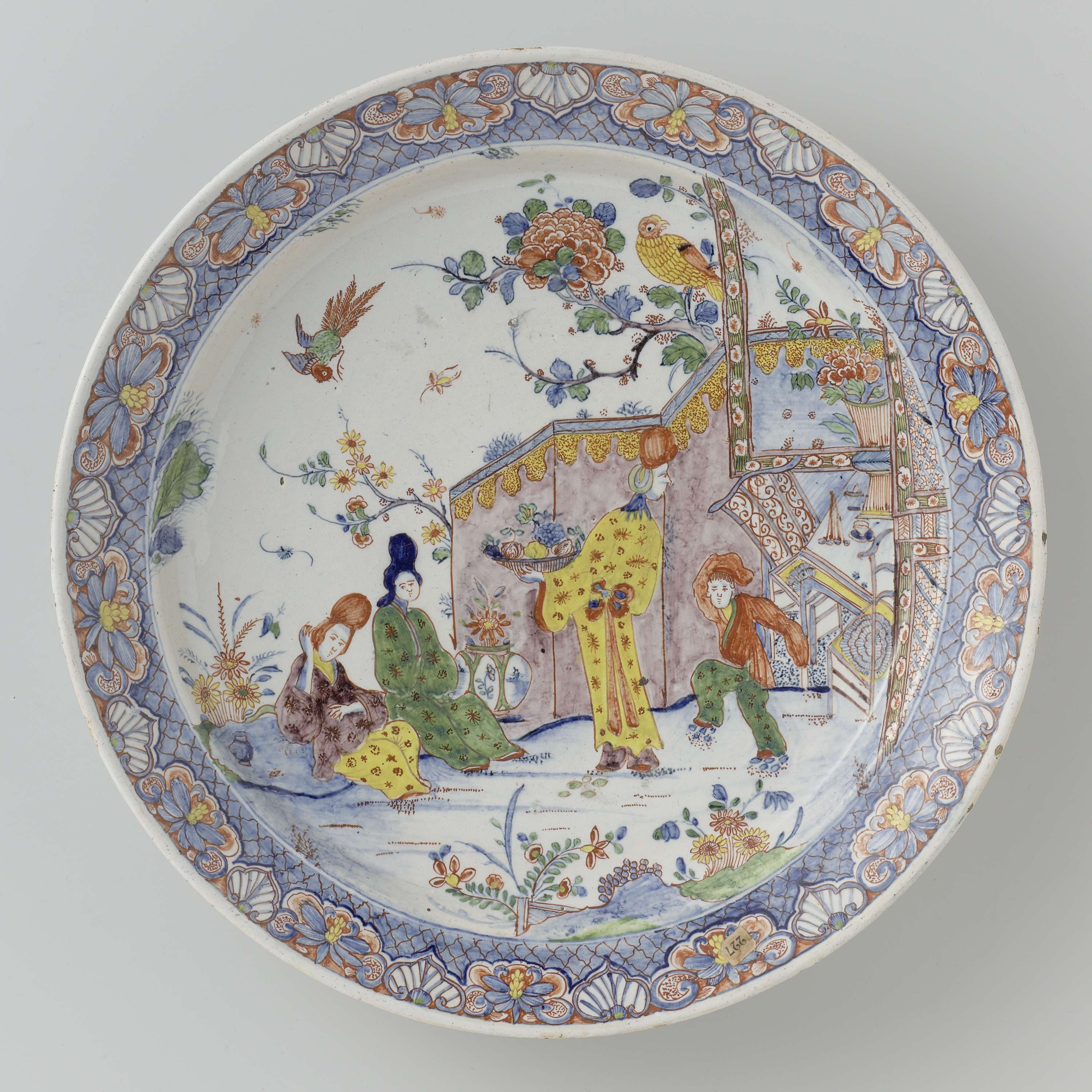 Schotel, veelkleurig beschilderd met vier Chinezen in een tuin (Nederlands)