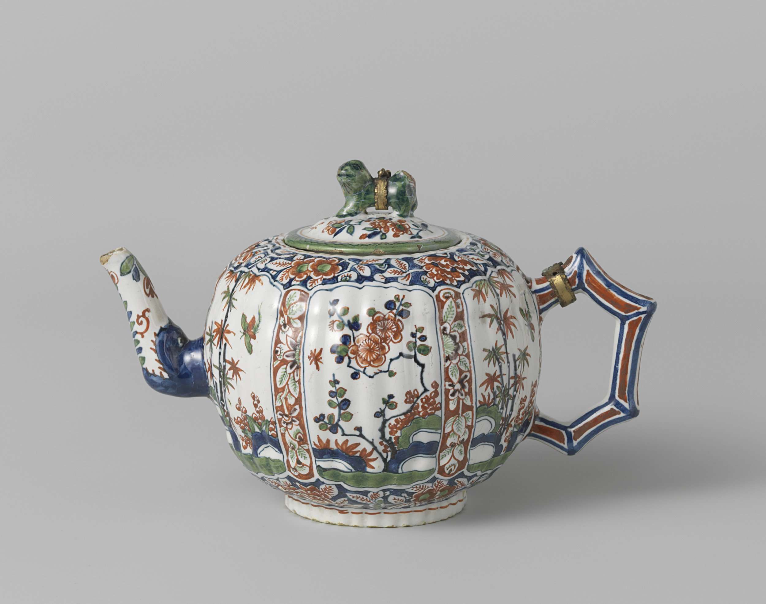 trekpot van faïence, geribd. Veelkleurig beschilderd met chinoiserie decoraties. (Nederlands)