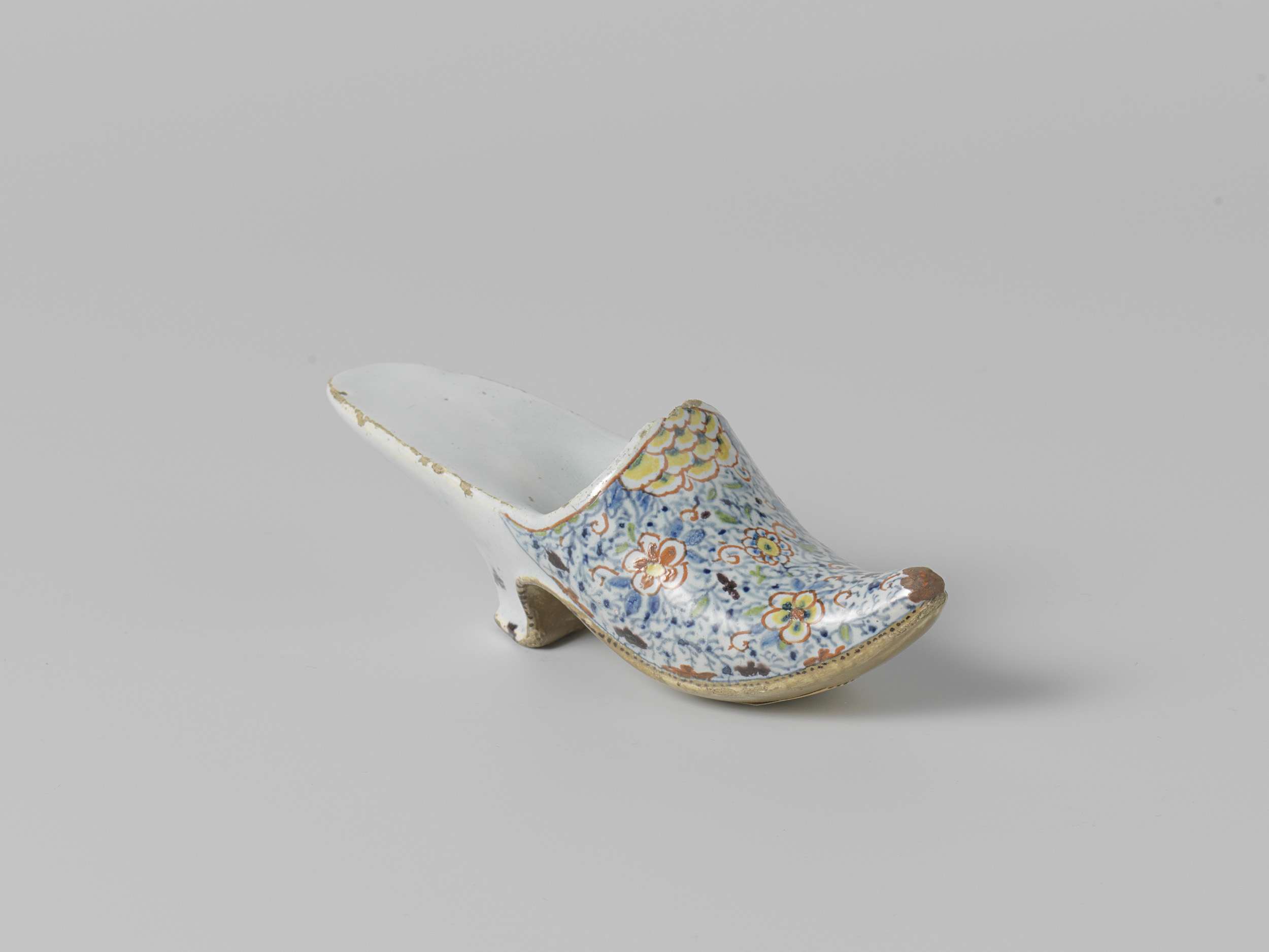Muiltje van faïence. Veelkleurig beschilderd met bloemen. (Nederlands)