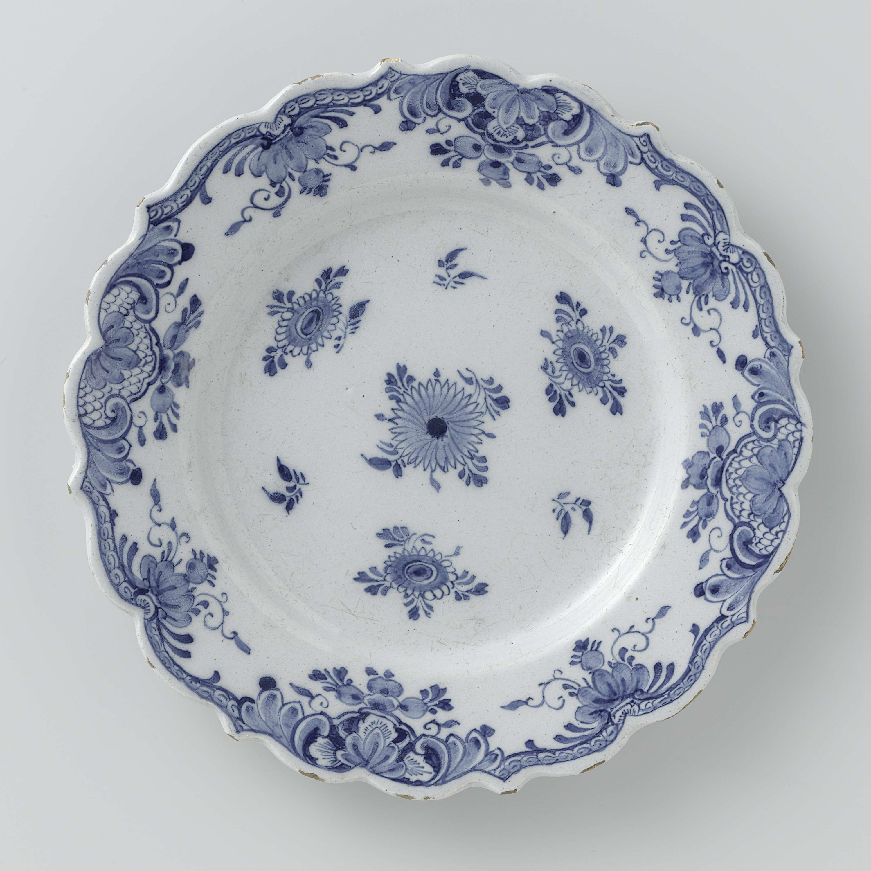 Bord van faience. Blauw beschilderd met bloemdecoratie. (Nederlands)