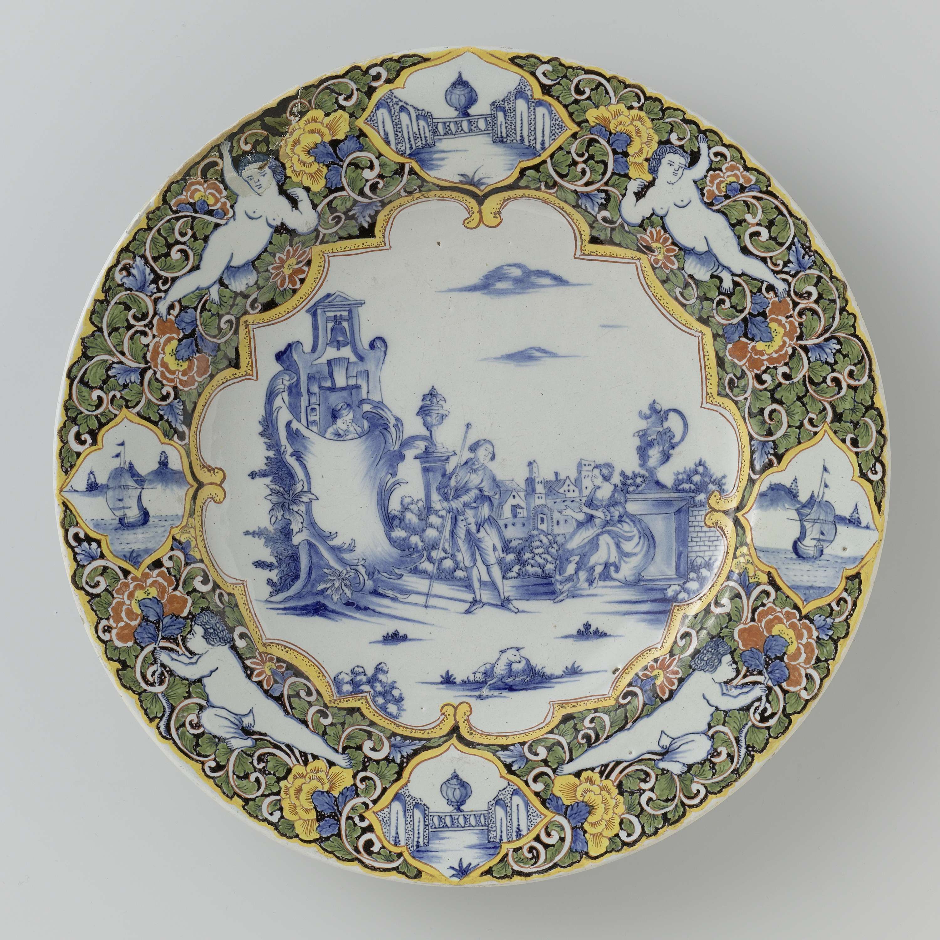 Ronde schotel van faïence. Schotel met op het plat in blauw een herdersscène binnen Louis XIV rand. Veelkleurige randversiering op zwarte grond met putti en vier medaillons. (Nederlands)