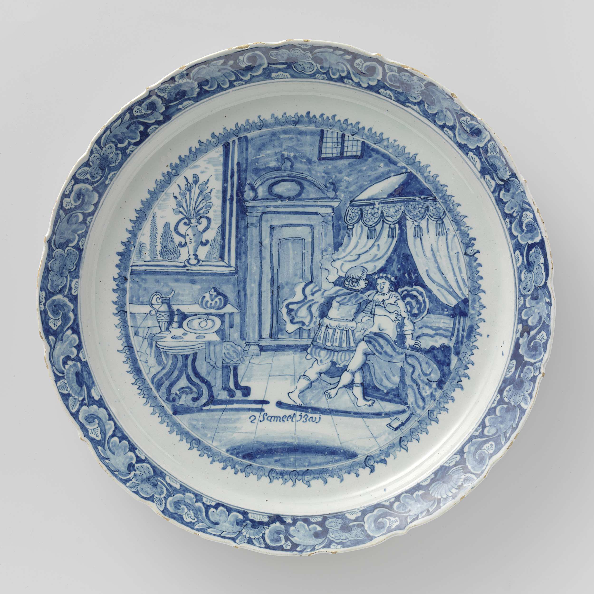 schotel van faïence, beschilderd in blauw met een voorstelling van Amnon, zoon van koning Salomo, die zich vergrijpt aan zijn halfzus Tamar (2 Samuel 13). (Nederlands)