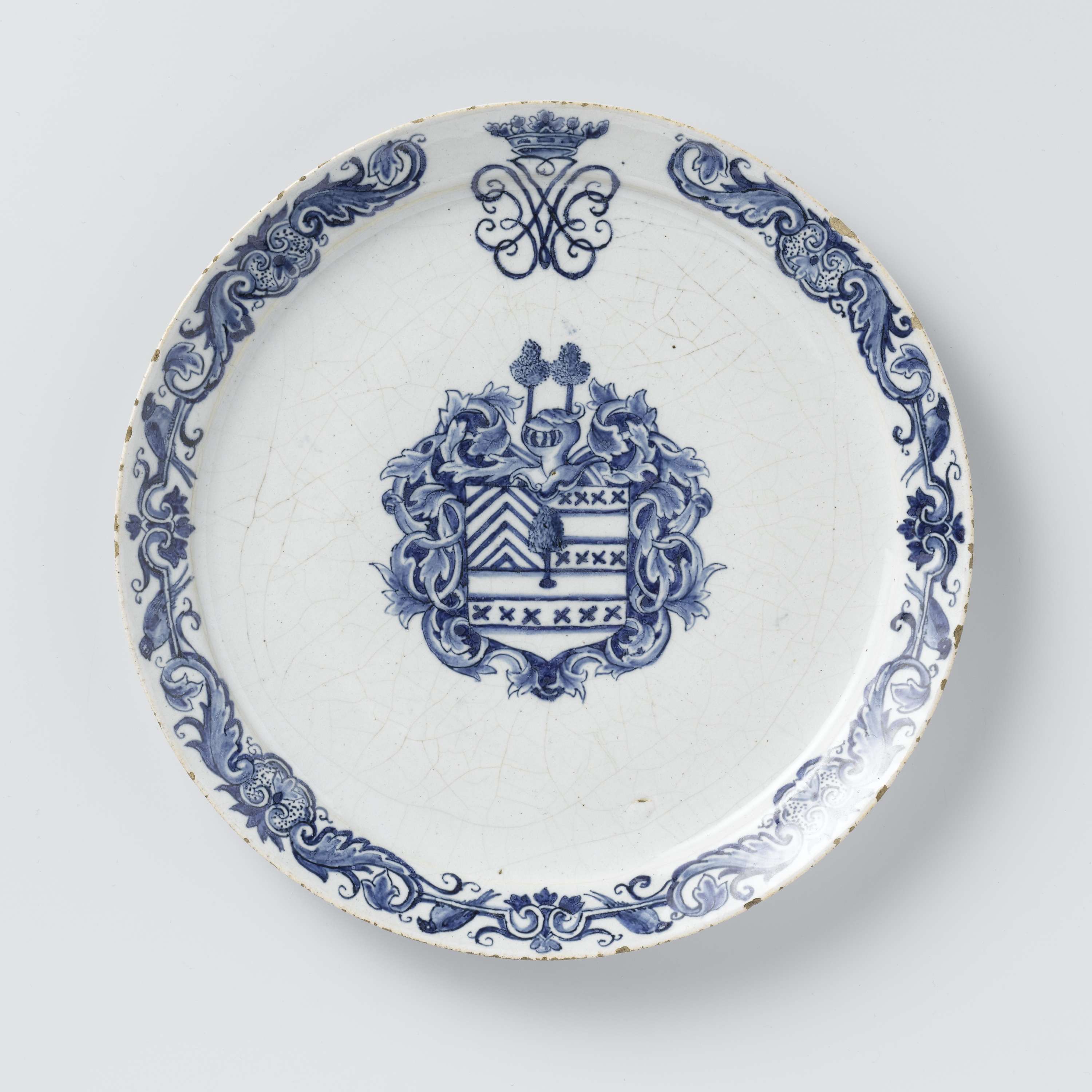 Bord van aardewerk beschilderd in blauw op tinglazuur met in het plat een onbekend wapen, mogelijk van een lid van een onbekend geslacht Van Egmond. Daarboven een gekroond spiegelmonogram J.V.E. De rand gedecoreerd met bladwerk. (Nederlands)