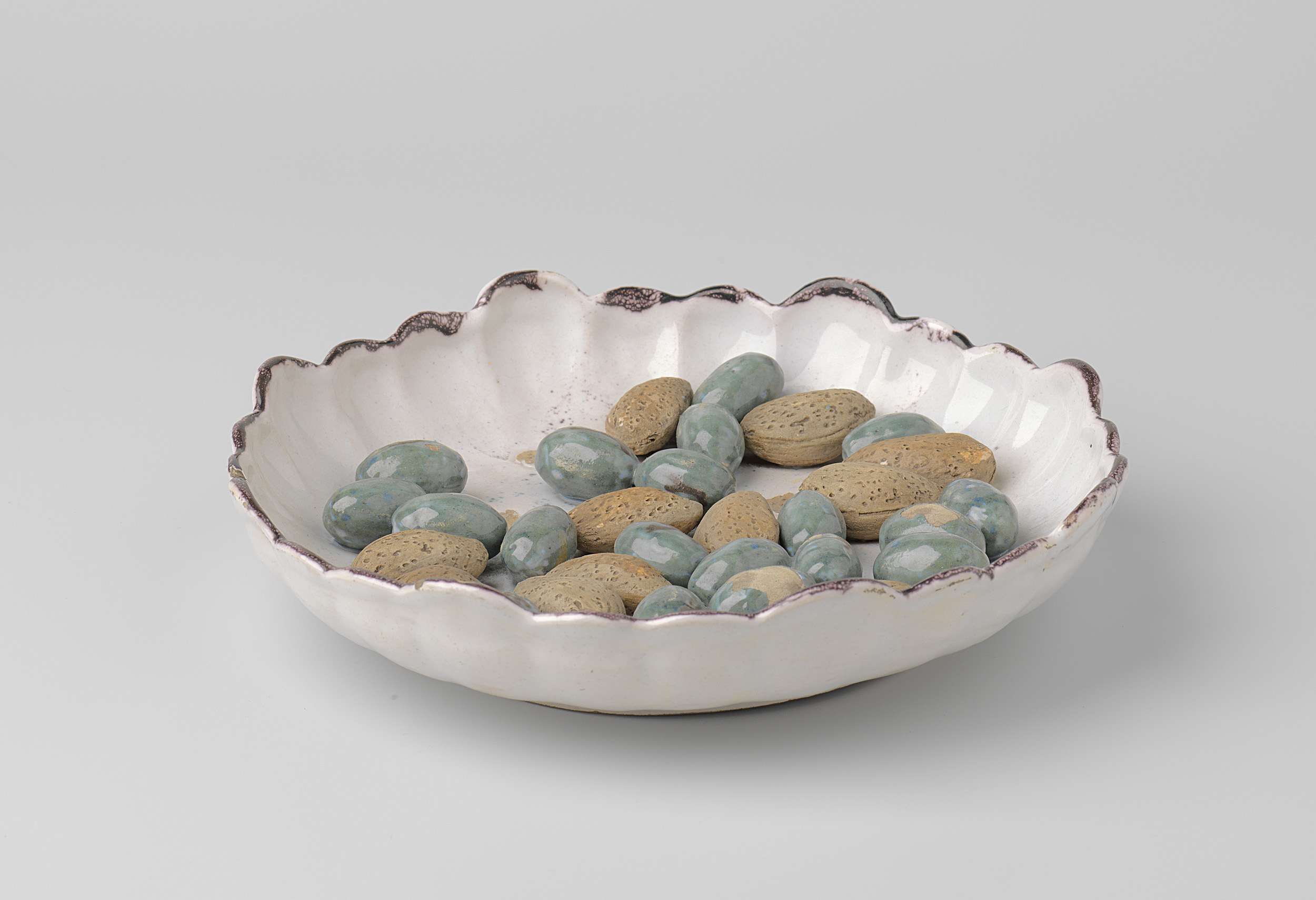 Ronde, witte schotel met olijven en amandelen van veelkleurig beschilderde faience. De schotel heeft een geschulpte rand en op de schotel zijn amandelen en olijven bevestigd, waarvan er vier ontbreken. (Nederlands)