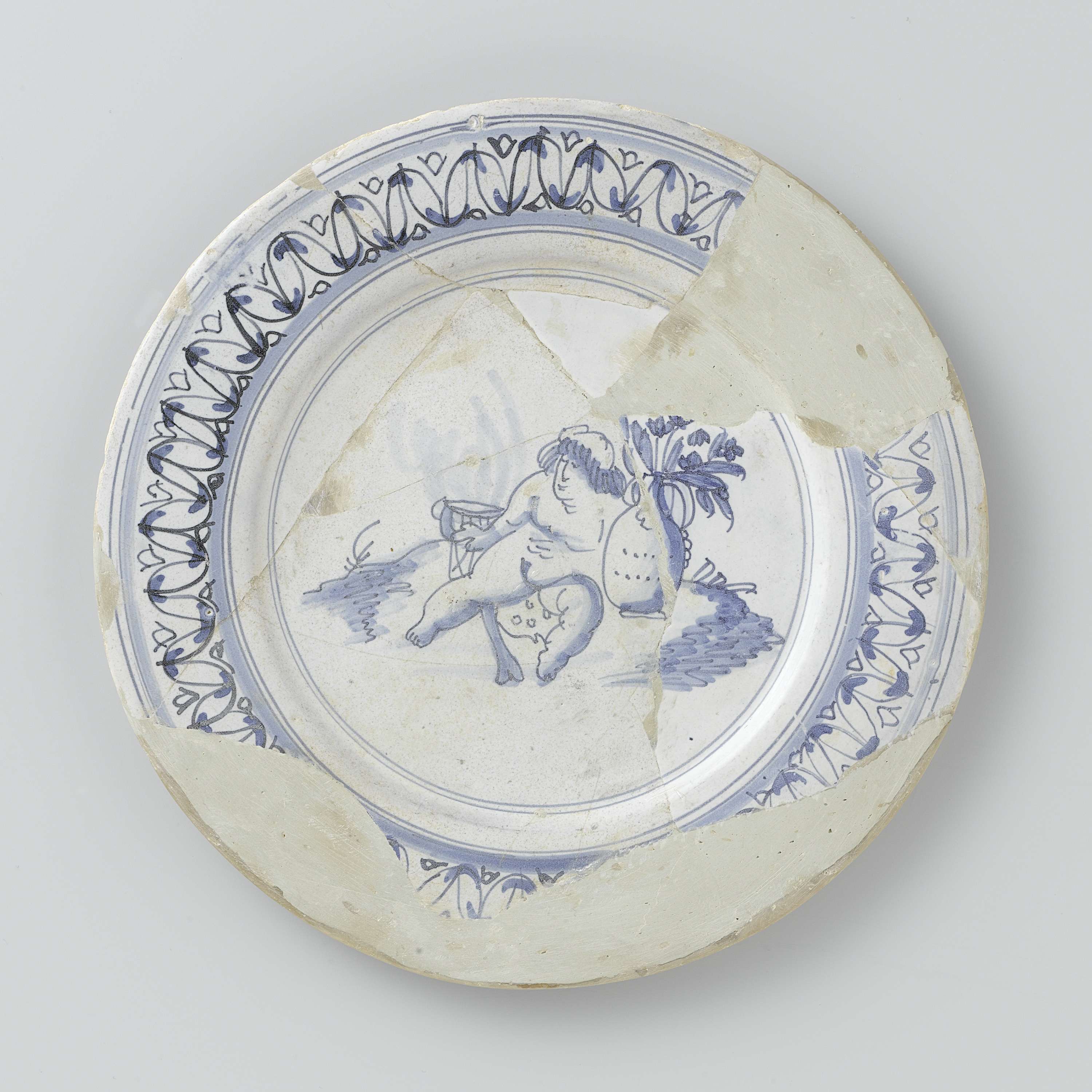 Fragmentarisch bord van blauw beschilderde faience. Op het plat is een figuur (Bacchus ?) naast een vaas met bloemen geschilderd en op de rand een rankenmotief. Het bord is een bodemvondst uit Delft, ontbrekende delen zijn aangevuld. (Nederlands)
