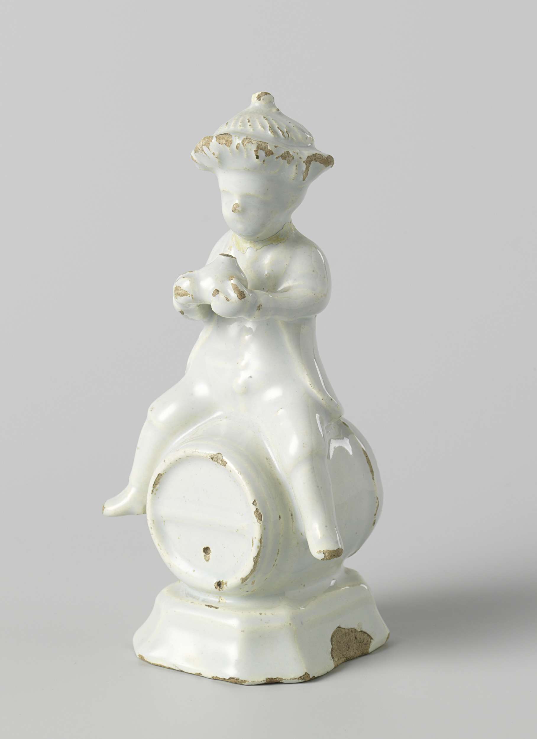 Beeld van ongedecoreerde faience. Op een rechthoekig voetstuk met afgeschuinde hoeken ligt een ton. Op de ton zit een jongen met een hoed op zijn hoofd en een fles in zijn handen. (Nederlands)