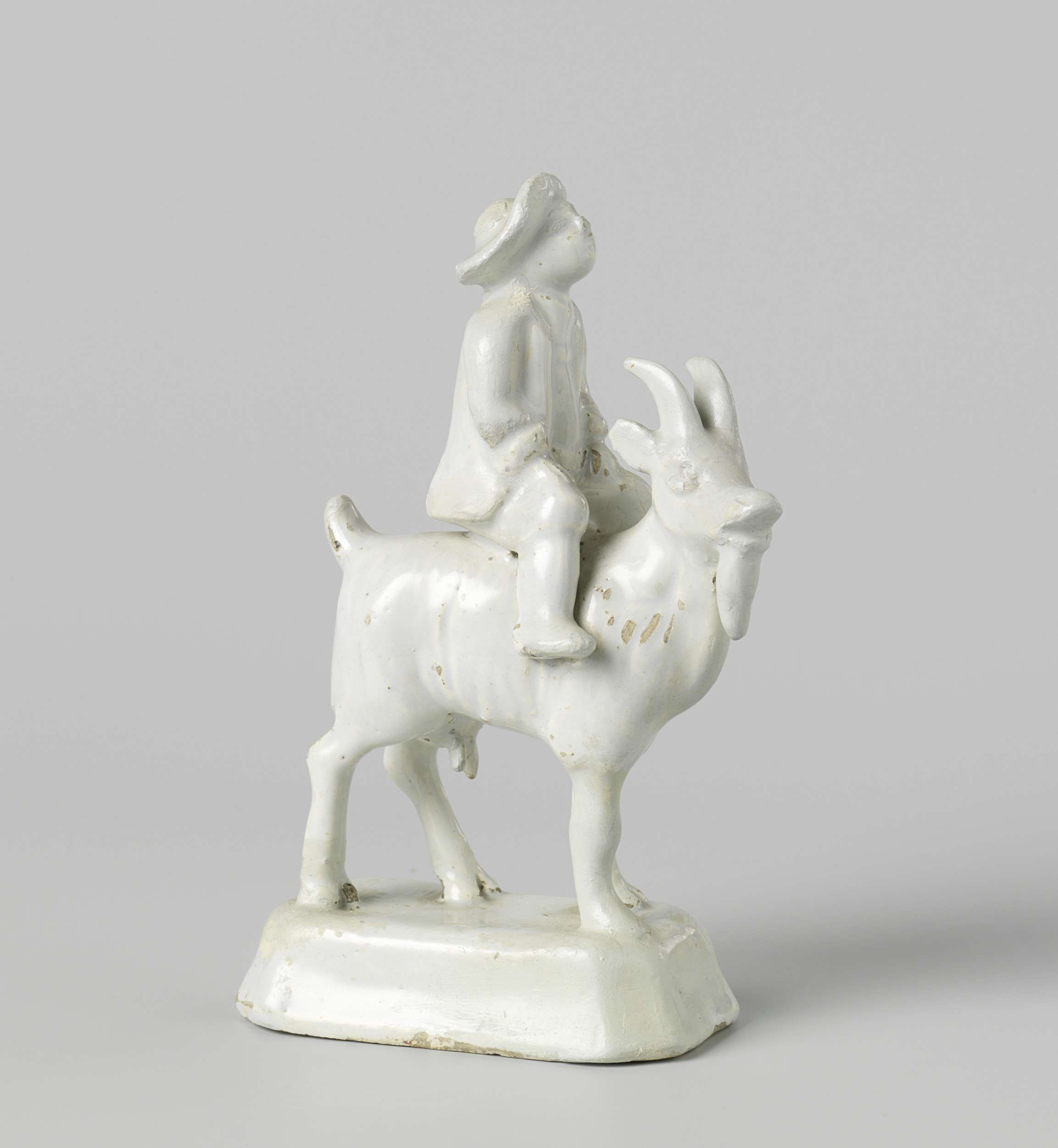 Beeld van ongedecoreerde faience. Op een rechthoekig voetstuk met afgeschuinde hoeken staat een geit met op de rug een man met een hoed. Het linker achterbeen van de geit is voor het rechter achterbeen geplaatst. (Nederlands)