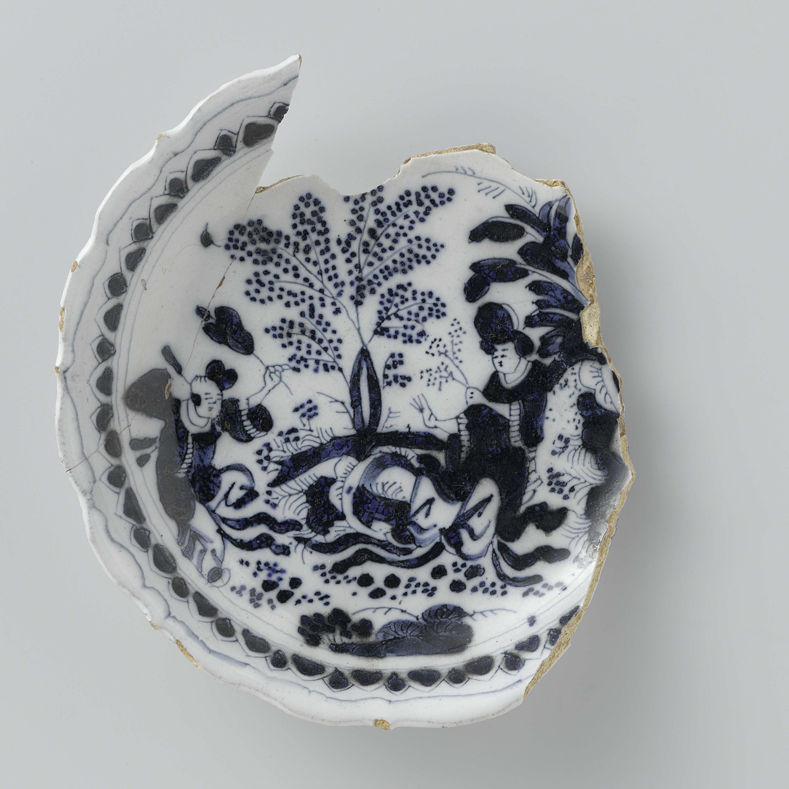Schotel (fragmentarisch) van blauw beschilderde faience, met een geschulpte rand. Op de schotel zijn figuren (Chinezen) aan weerszijden van een boom geschilderd. De schotel is een bodemvondst uit Delft. (Nederlands)