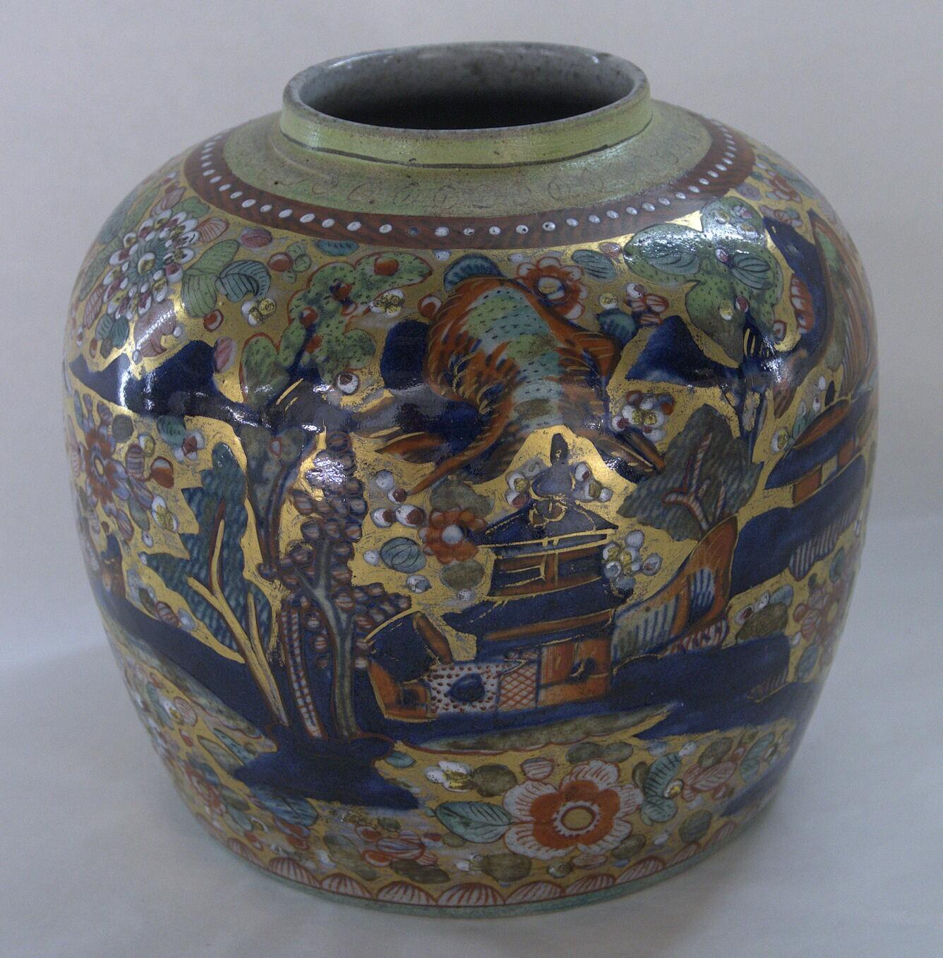Gemberpot zonder deksel. Porselein met blauw decor onderglazuur en in Holland uitgevoerde gehele overdecoratie in verschillende emaillekleuren, ijzerrood en goud (Amsterdams bont). (Engels)