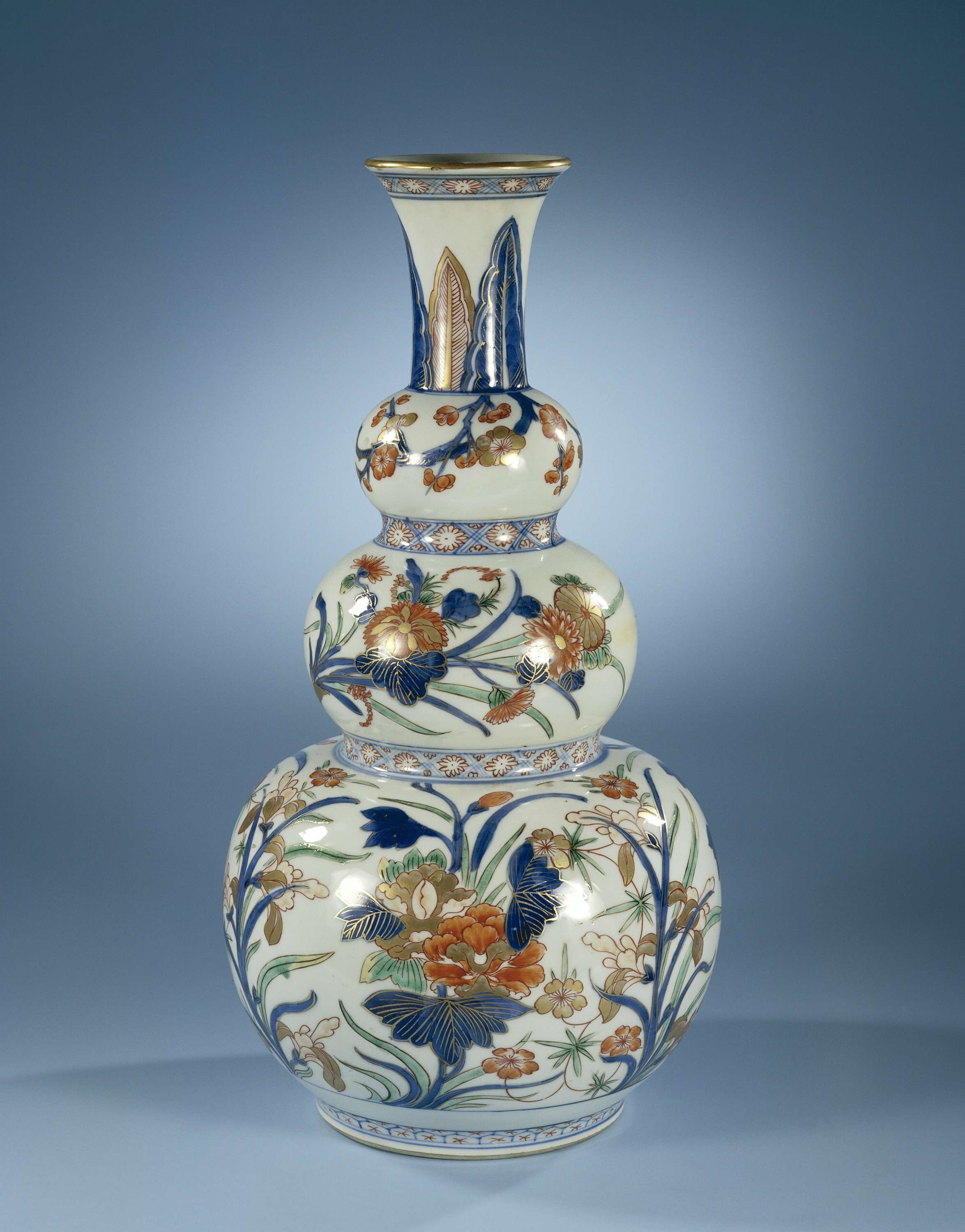 Triple gourd vase painted in Japanese style with large flower sprays (Engels)