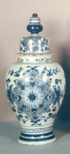balustervorm, hoedvormig deksel met grote peervormige knop; op de buik een groot rozet, daaromheen grote driebladige, ingestippelde bladvormen met ranken; aan de achterzijde een insect(?) boven riet; op voet twee sierbanden, band van boogjes en drie concentrische ringen; op schouder een concentrische ring; op de hals een band van losse ranken afgewisseld door kruiselings liggende boogjes; op deksel hetzelfde rozet als op buik; achterzijde deksel insect boven twee bloemen; dekselknop sierbanden (Engels)