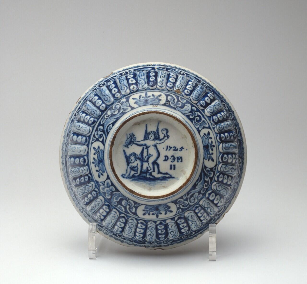 Dekselkom met aan de onderkant op het plat een decoratie van een engel op de rug van een kruipende engel met wijnglas en kruik, het jaartal 1725 en D 3 M. Op de buitenwand verticale ribbels. glazuur aan de randen mist. (Engels)