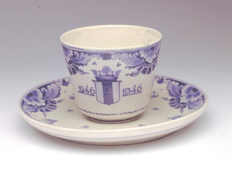 De kop en schotel zijn vervaardigd ter gelegenheid van het 700-jarig bestaan van de stad Delft. Van de kop is het oor verloren gegaan. De versiering bestaat uit onder meer het wapen van Delft en lambrequinachtige motieven langs de randen met sterretjes en insekten. (Engels)
