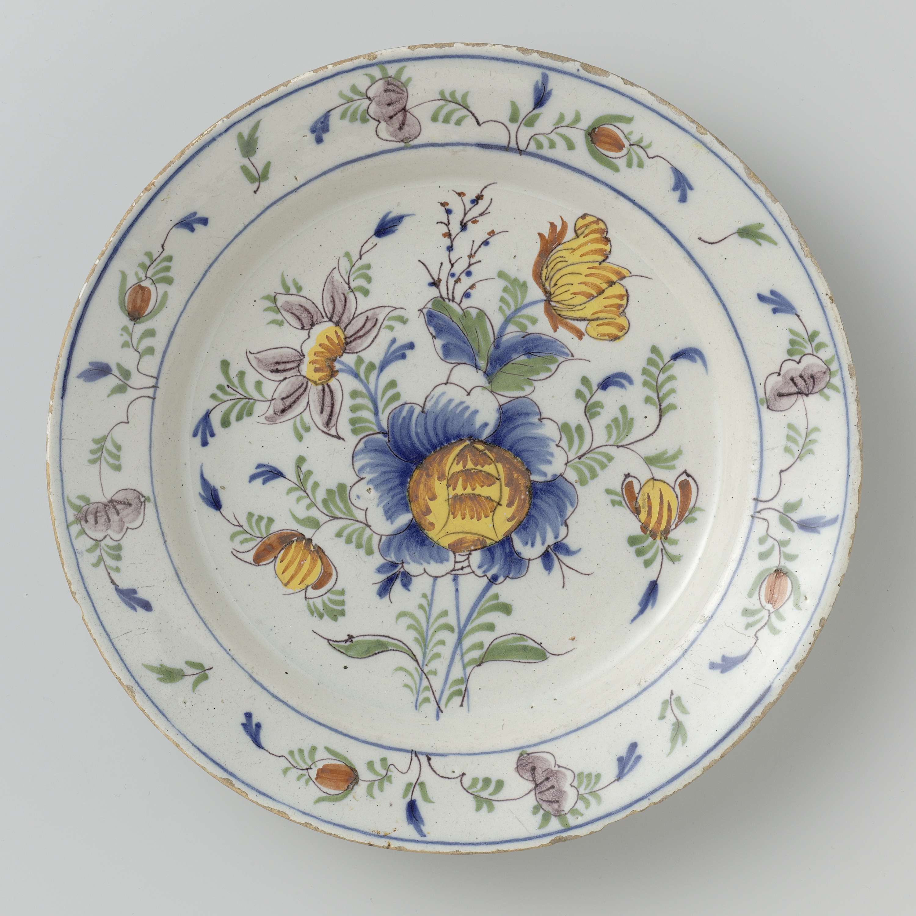 Rond bord van veelkleurig beschilderde faience, met op het plat een boeket bloemen in de kleuren blauw, geel, groen, paars en bruin. Op de rand zijn losse bloemtakken geschilderd. (Nederlands)