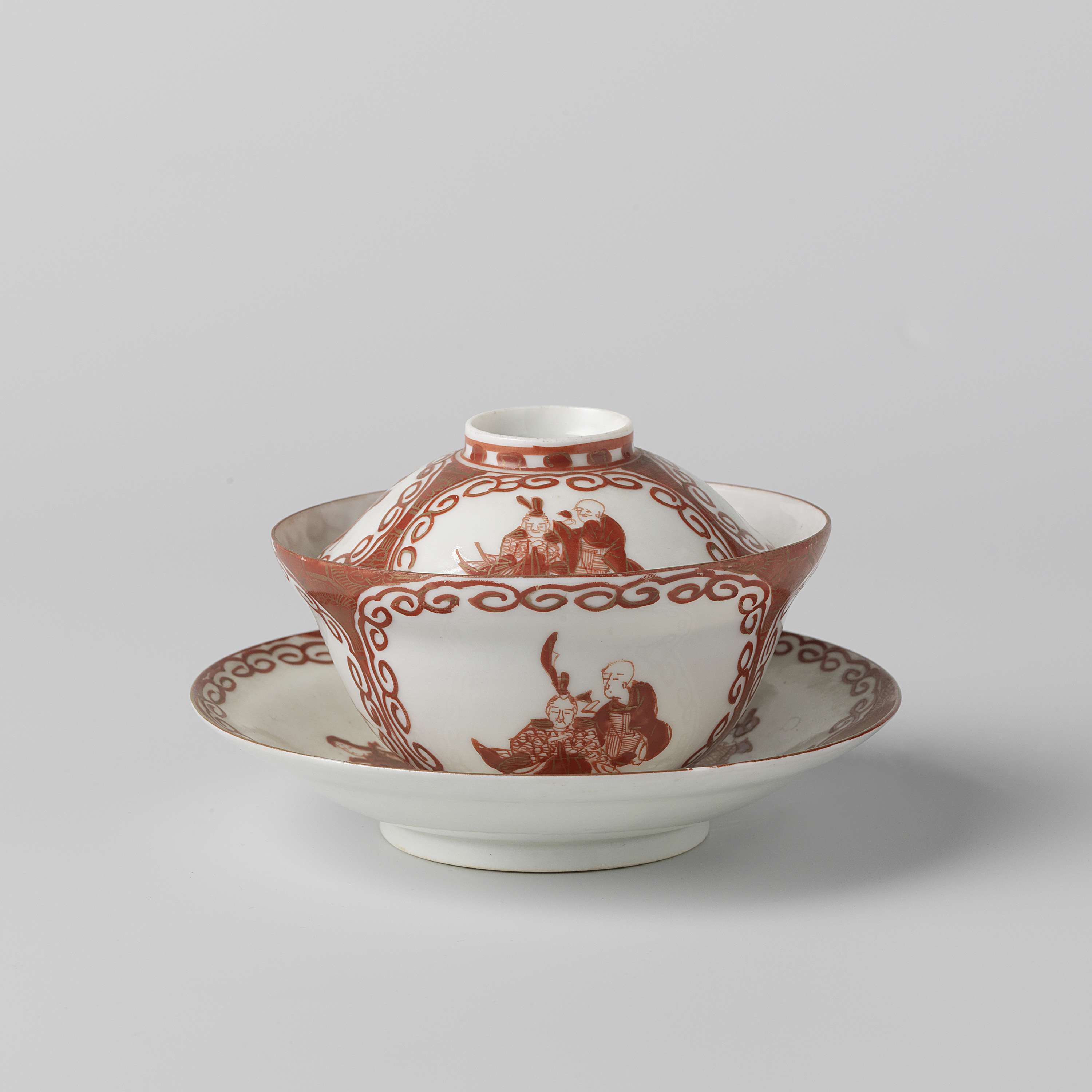 Klokvormige dekselkop en schotel van porselein met een ringvormige knop, beschilderd op het glazuur in rood en goud. Op de voorzijde van de schotel drie cartouches met telkens twee zittende mensen omgeven door een band krulwerk; tussen de cartouches een geometrisch patroon. Gemerkt op de onderzijde met drie ongeïdentificeerde karakters. (Nederlands)