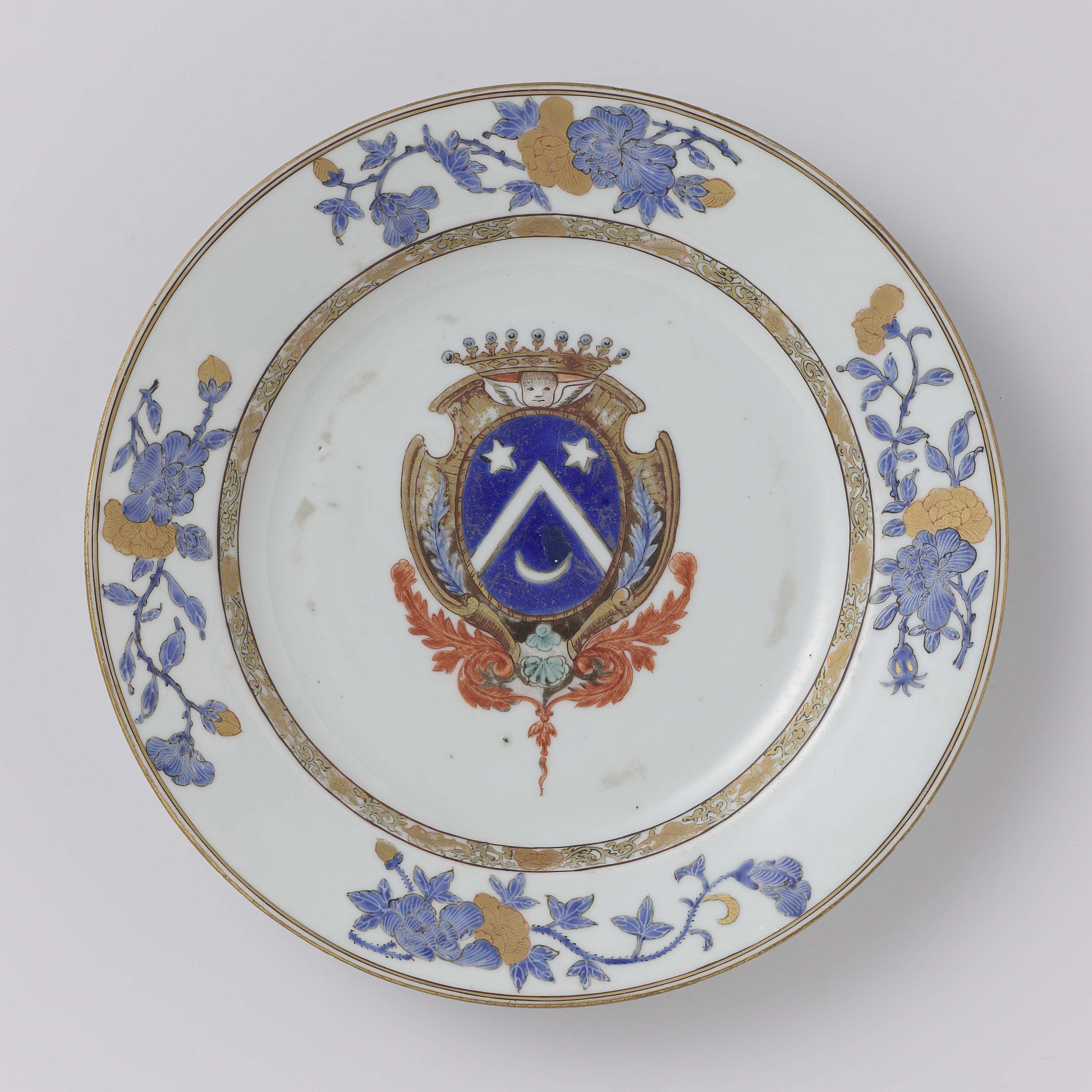 Bord van porselein, beschilderd op het glazuur in blauw, rood, zwart en goud. Op het plat een gekroond wapen met twee sterren, een keper en een halve maan uitgespaard in een blauwe achtergrond; het helmteken is een putto onder een kroon met parels; om het wapen een schelpmotief en bladranken. Op de wand een band met bloemranken; de rand met vier bloemtakken (pioen). Wapenporselein met emailkleuren. (Nederlands)
