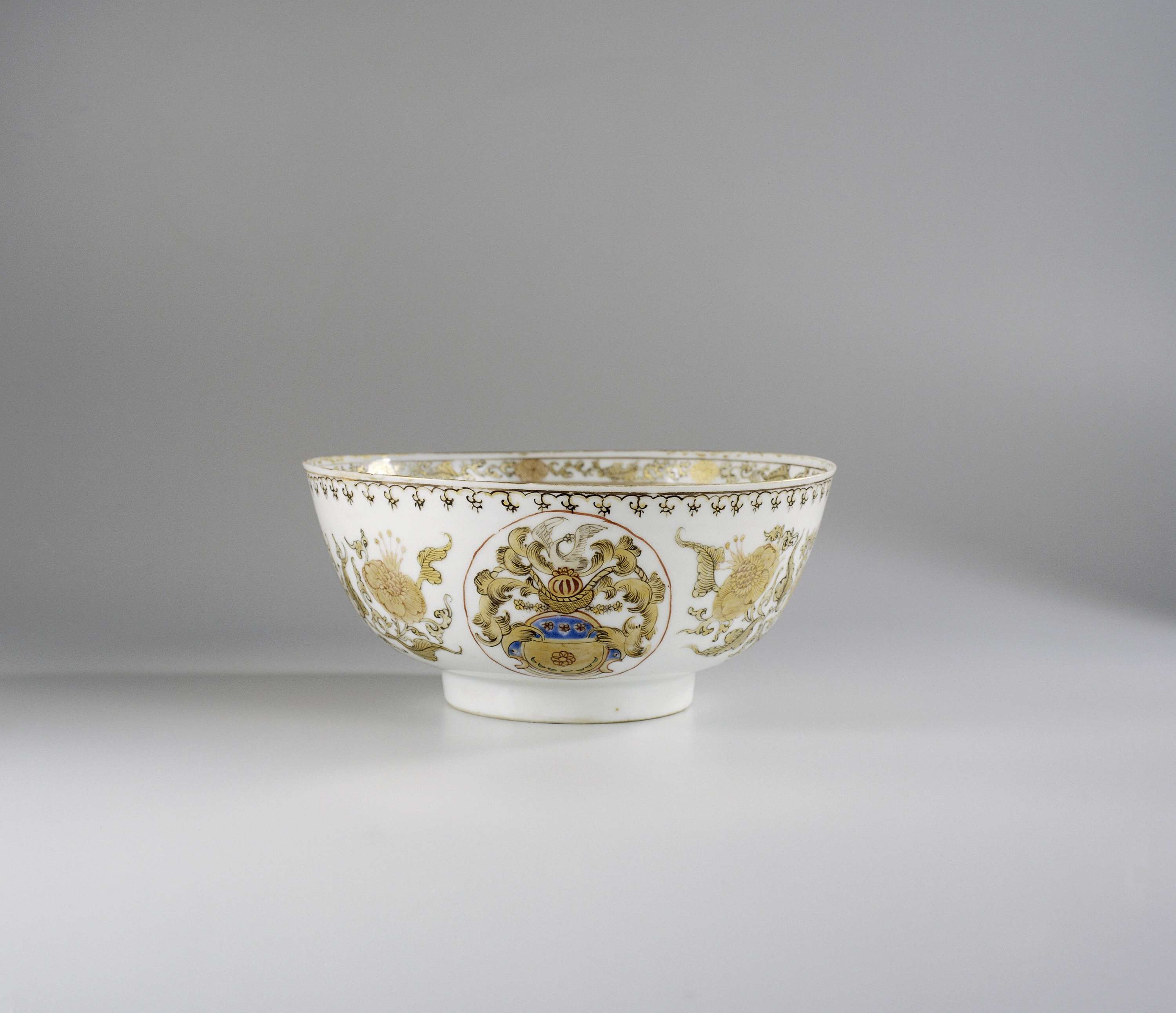 Kom, beschilderd in encre de Chine, emails en goud met twee maal een medaillon met een familiewapen en met bloemtakken. Langs de buitenrand een spearhead-rand, langs de binnerand een decoratieve band. (Nederlands)