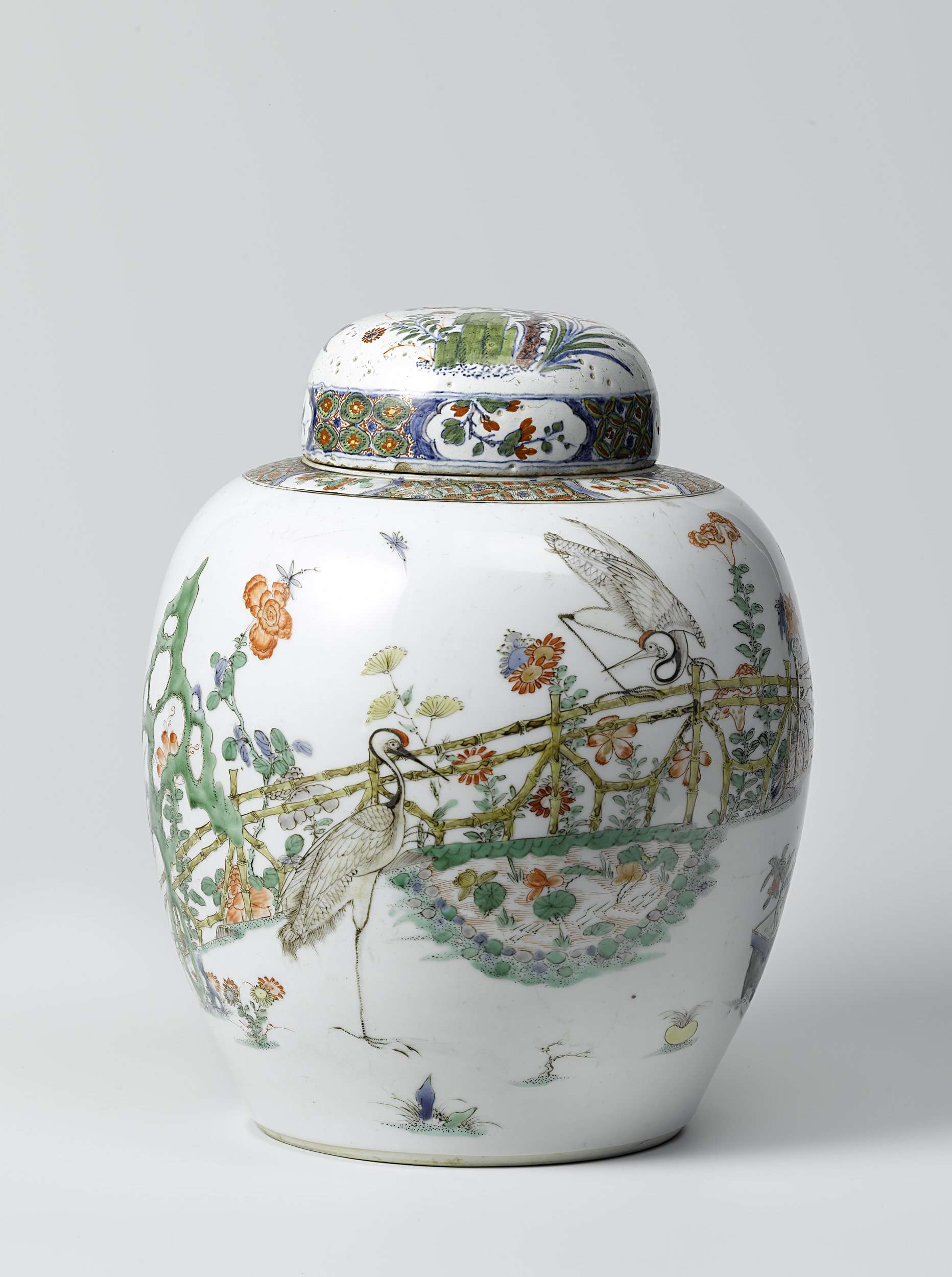 Eivormige dekselpot van porselein, beschilderd op het glazuur in blauw, rood, groen, geel, aubergine en zwart. Op de wand een omheinde tuin met twee kraanvogels, één staand en een op het hek, bij een vijver met lotusplanten, een rots en een bloeiende boom (magnolia). Om de vijver bloeiende planten (chrysant, prachtanjer, pioen, aster, lelie) en twee bloempotten met pijnboom, bamboe en sinaasappel. In de magnoliaboom een papegaai op een rekje. Hiernaast twee vliegende vogels. Op de schouder servetwerk afgewisseld met bloemtakken in cartouches. De deksel is later in dezelfde stijl met onderglazuur blauw bijgemaakt van Delfts aardewerk. De bovenzijde met bloeiende planten en vogels; de rand met een band servetwerk onderbroken door gelobde cartouches met bloemtakken. Famille verte. (Nederlands)