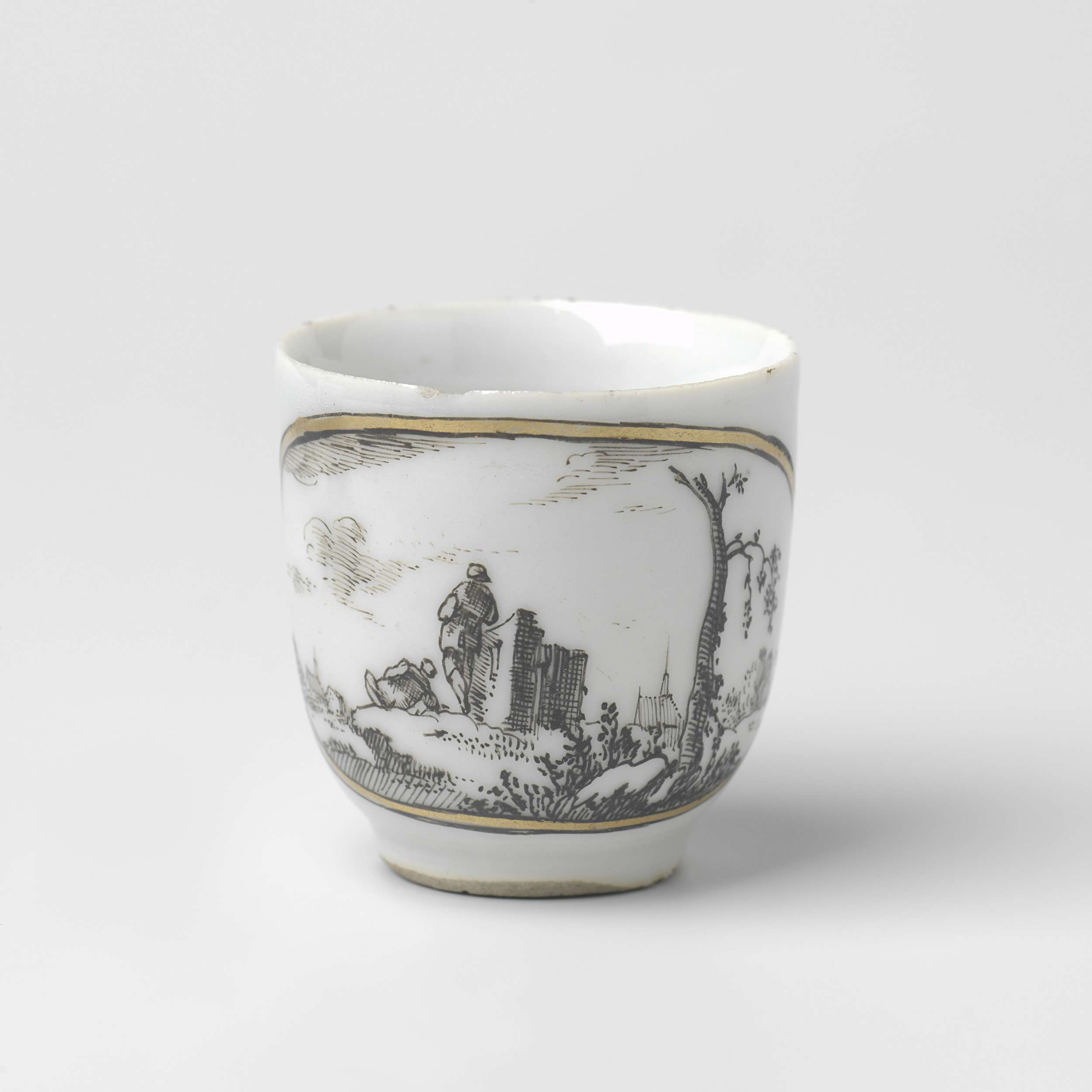 Oorkop van porselein beschilderd op het glazuur in zwart en goud. Op de buitenwand een Europees landschap met een persoon, gebouwen en bomen in een ovaal medaillon. In Europa gedecoreerd in encre de Chine. (Nederlands)