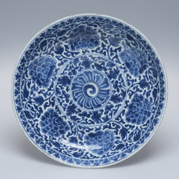 Schaal met gleufring en s-vormige wand. Versiering: in blauw onder glazuur. Buitenwand in 2, binnenkant in 5 zones. Vegetaal en Yin-Yang.||China||Keramiekmuseum Princessehof GRV 1929-396