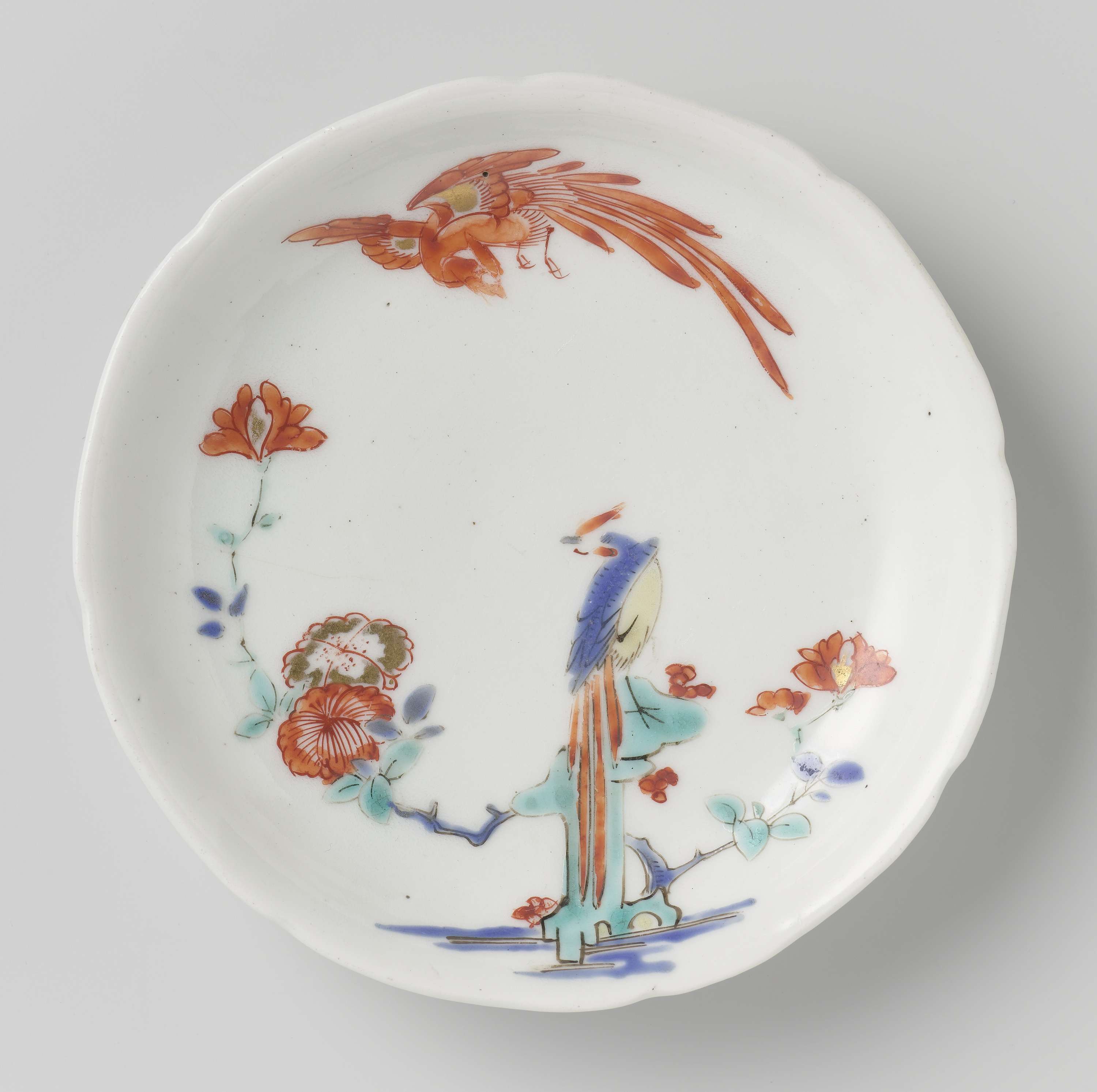 Geschulpte schotel van porselein, beschilderd op het glazuur in blauw, rood, groen, geel, zwart en goud met een een paar hoo-vogels, een in de lucht en een op een rots met een bloemtak. Oud label op de onderzijde met 'Collectie Westendorp/ 37'. Kakiemon-stijl. (Nederlands)