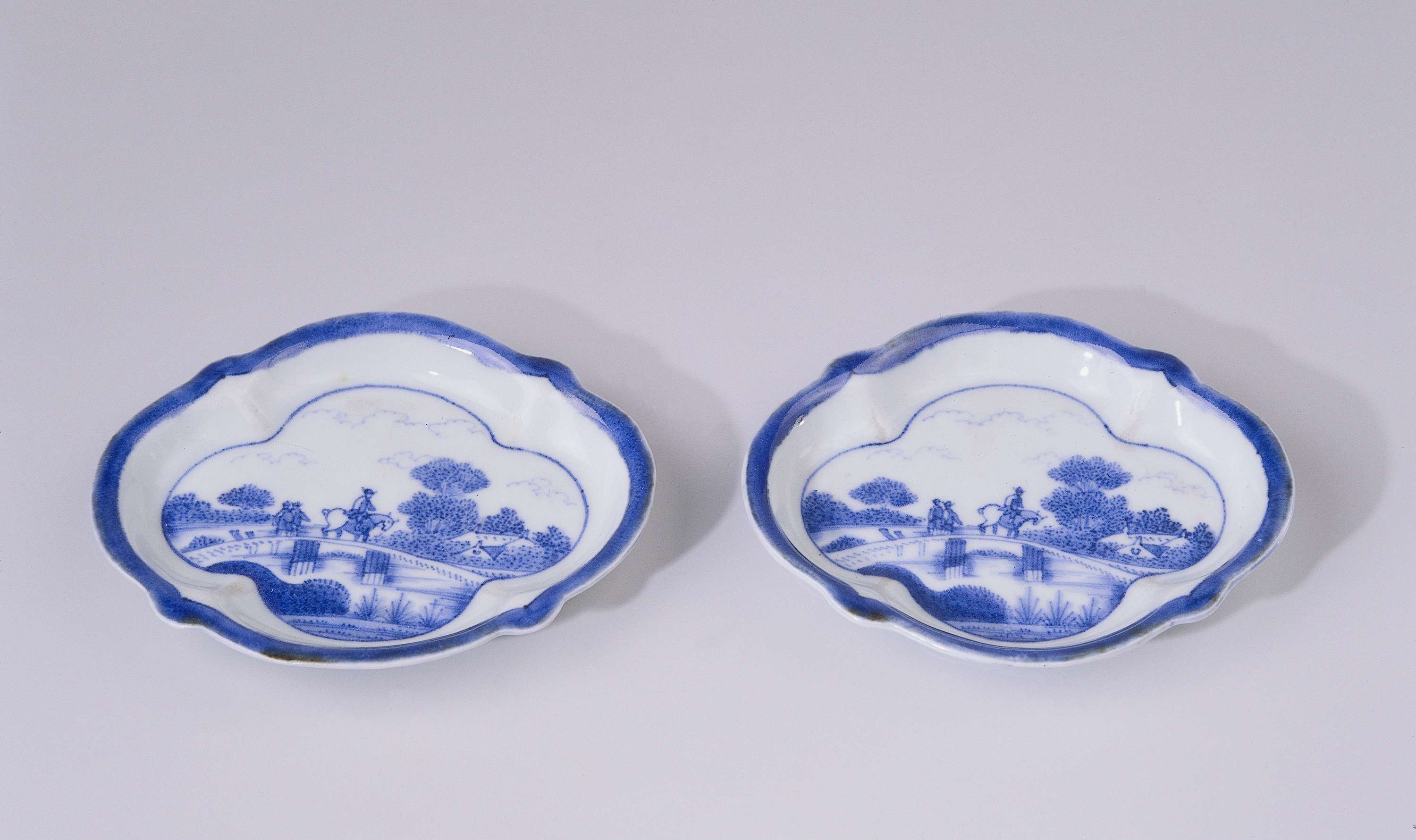 Schotel van porselein in de vorm van een vierpas met accoladevormige rand, beschilderd in onderglazuur blauw. Op het plat een rivierlandschap met daarin een ruiter en twee lopende mensen op een brug. Op de achtergrond huizen, bomen en wolken. De binnenrand is met een blauwe band. Gemerkt op de onderzijde met het zes-karaktermerk van keizer Chenghua. Een proen op de onderzijde. Arita, blauw-wit. (Nederlands)