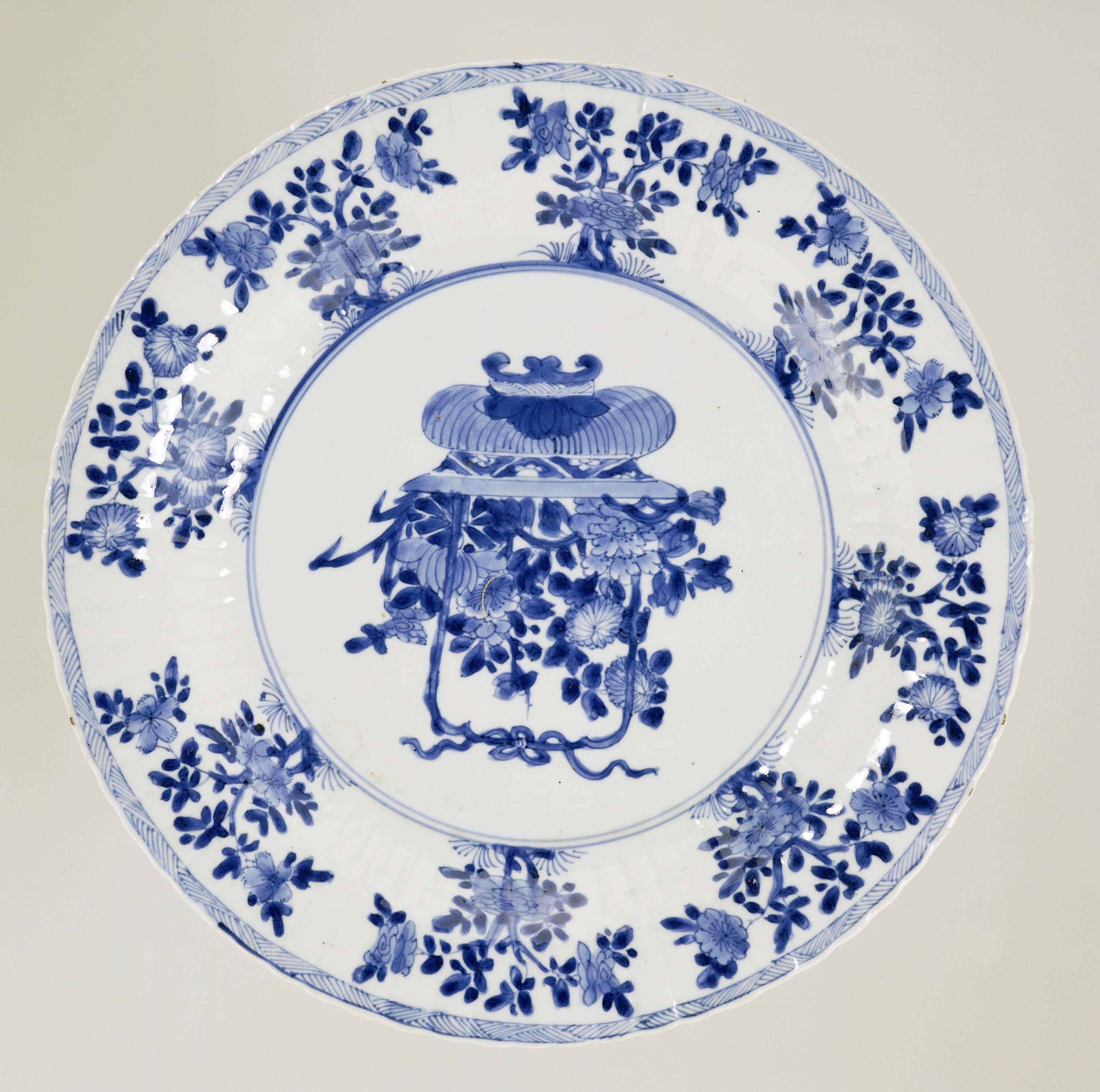 Schotel van porselein met geribde wand en gelobde rand, beschilderd in onderglazuur blauw. Op het plat een bloemenmand met chrysant, pioen en lotus; de wand met bloeiende planten; op de rand een band met arceerwerk; op de achterzijde drie bloemtakken. Gemerkt op de onderzijde met een artemisiablad in een dubbele cirkel. Blauw-wit. (Nederlands)