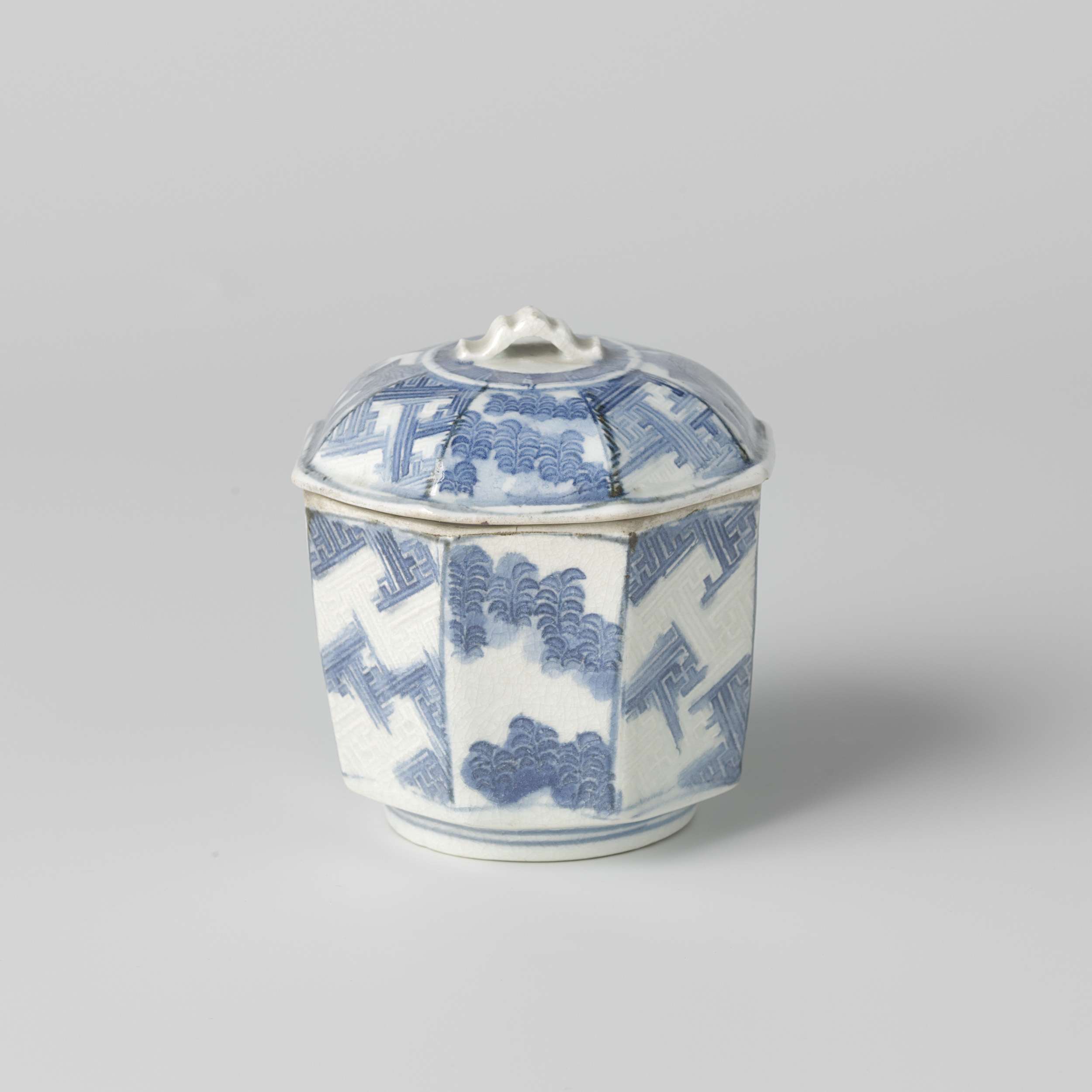 Achthoekige dekselpot van porselein, beschilderd in onderglazuur blauw. Op de wand twee vakken met bundels bamboe, twee met planten en vier met een swastika patroon in reliëf. De deksel met dezelfde decoratie met rond de knop een band met een meander-patroon. Gecraqueleerd glazuur. Blauw-wit. (Nederlands)