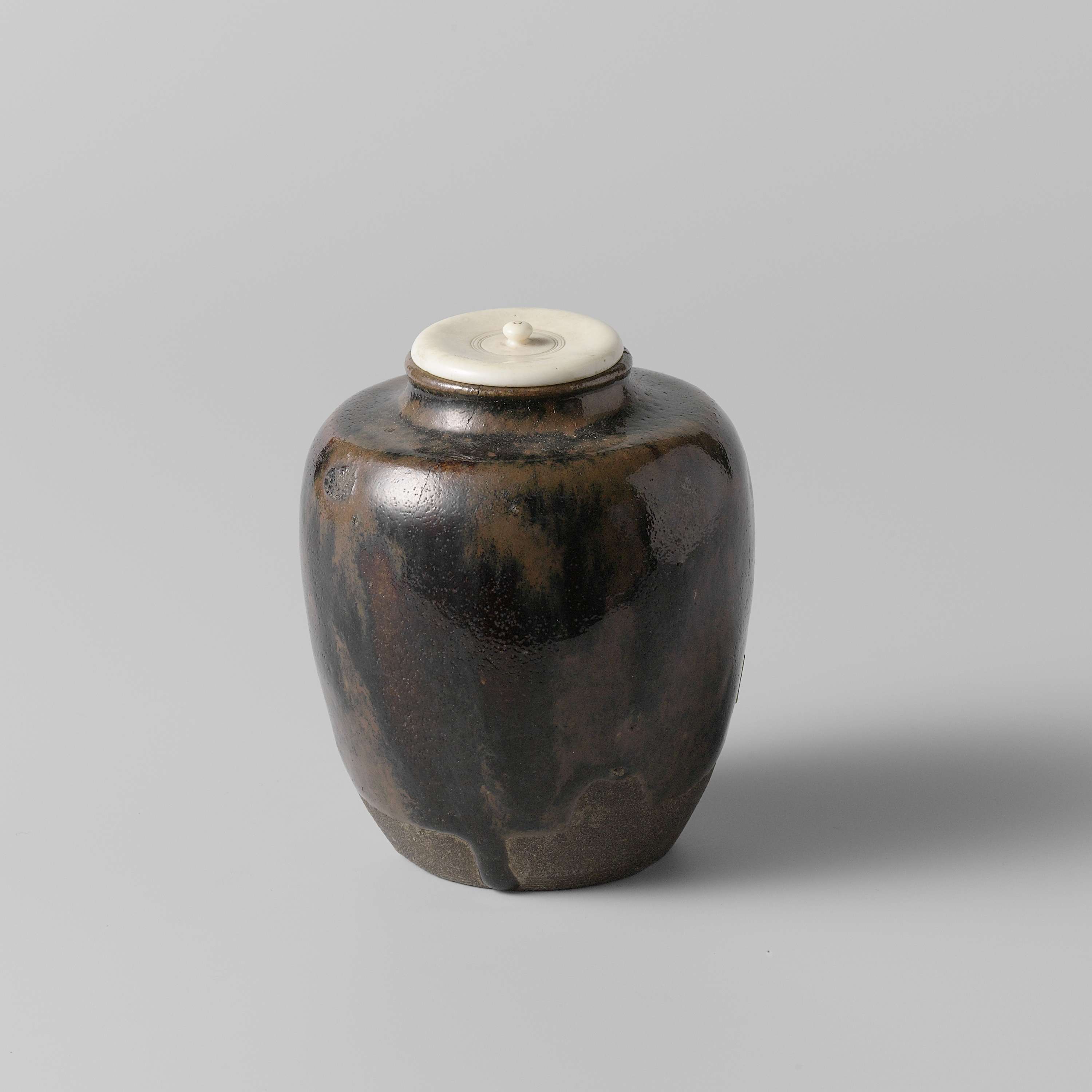 Stoftheebus of chaire van steengoed met een ivoren deksel, gedeeltelijk bedekt met een bruinzwart glazuur. Het onderste deel van de bus is ongeglazuurd. Oud label op de onderzijde met 'W580'. Seto. (Nederlands)