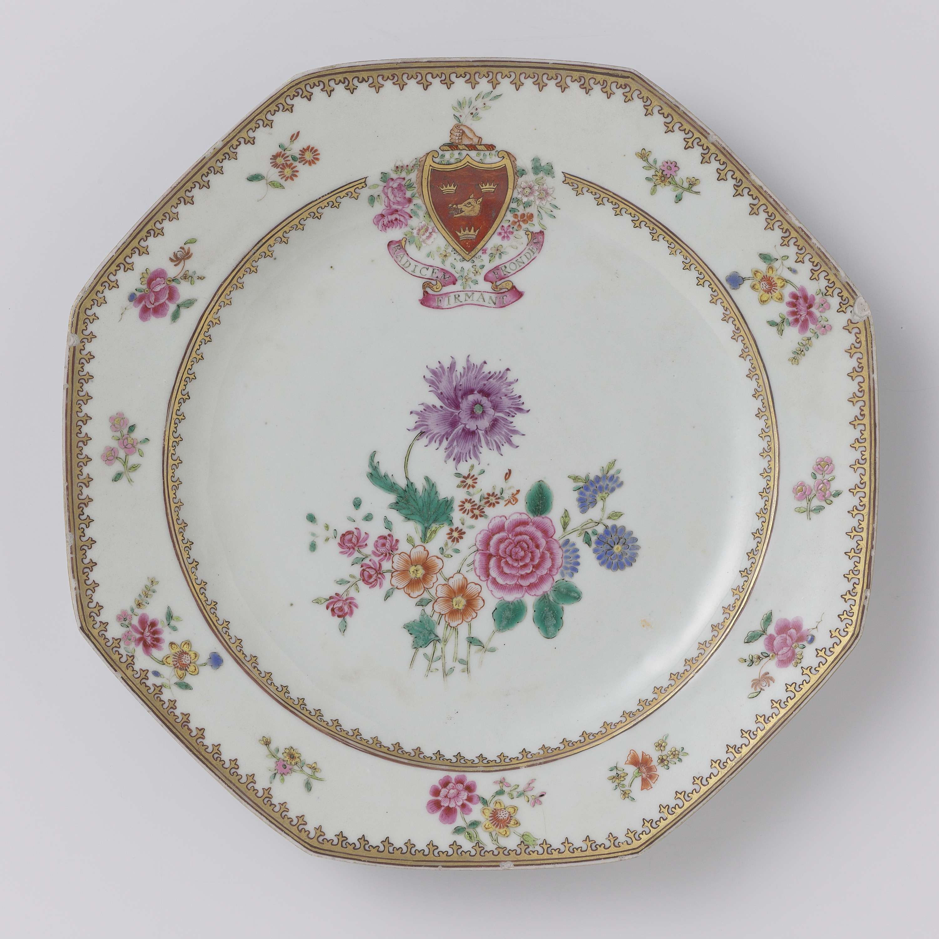 Achtkantig bord beschilderd in famille rose-kleuren en goud met in het plat bloemtakken omgeven door een spearhed band en het wapen van de familie Grant. Op de rand bloemtakken en een spearhead band. (Nederlands)
