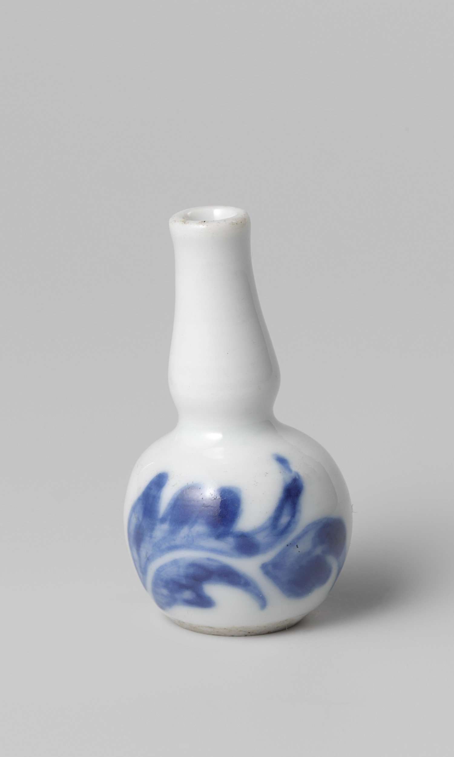 Miniatuur flesvormige vaas van porselein met een kalebasvormig lichaam, beschilderd in onderglazuur blauw. Op de buik een gestileerde bloemtak. Blauw-wit. (Nederlands)