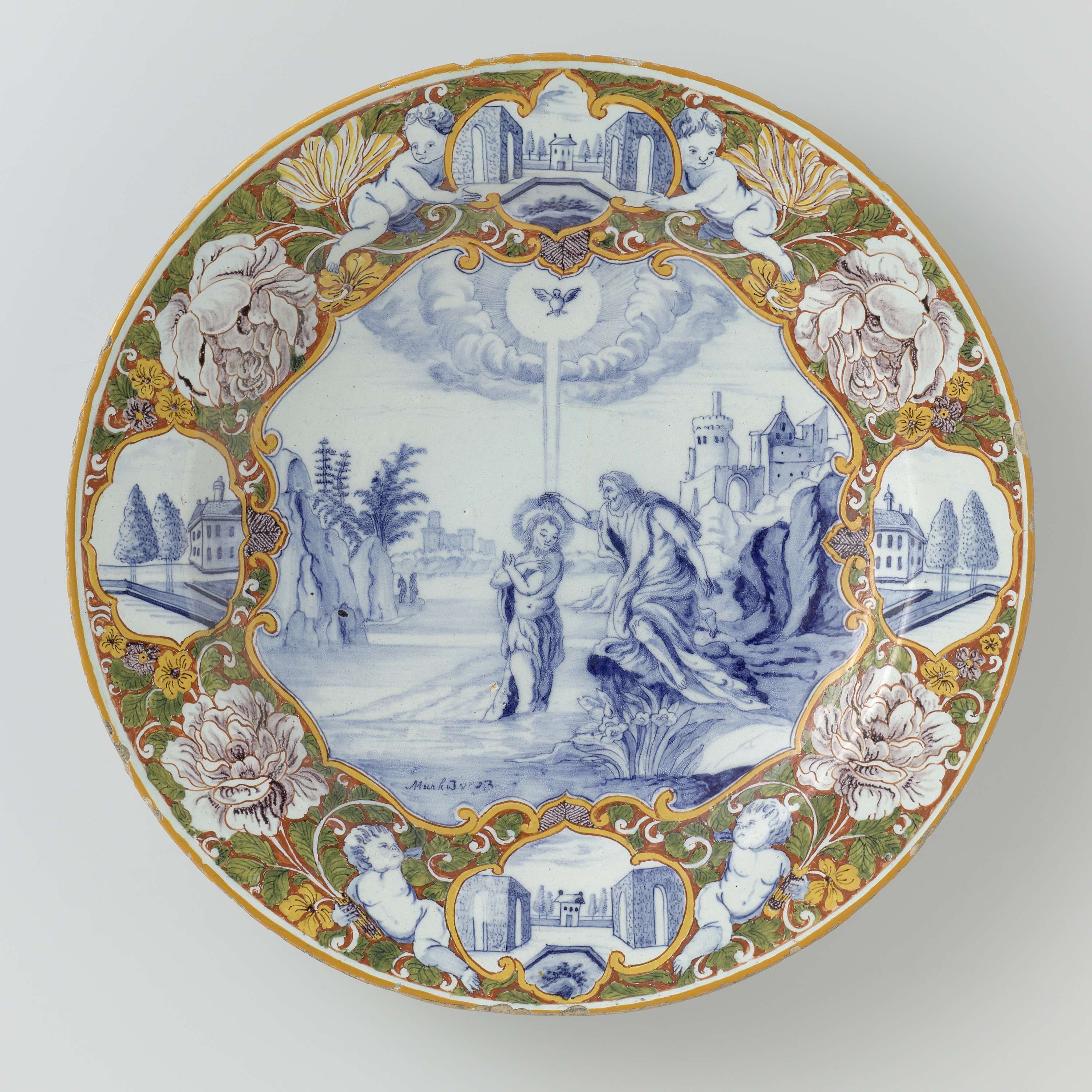 Schotel van faïence. In blauw op het plat de doop in de Jordaan. Daar omheen een veelkleurige bloemenrand met putti en landschapjes in blauw. (Nederlands)