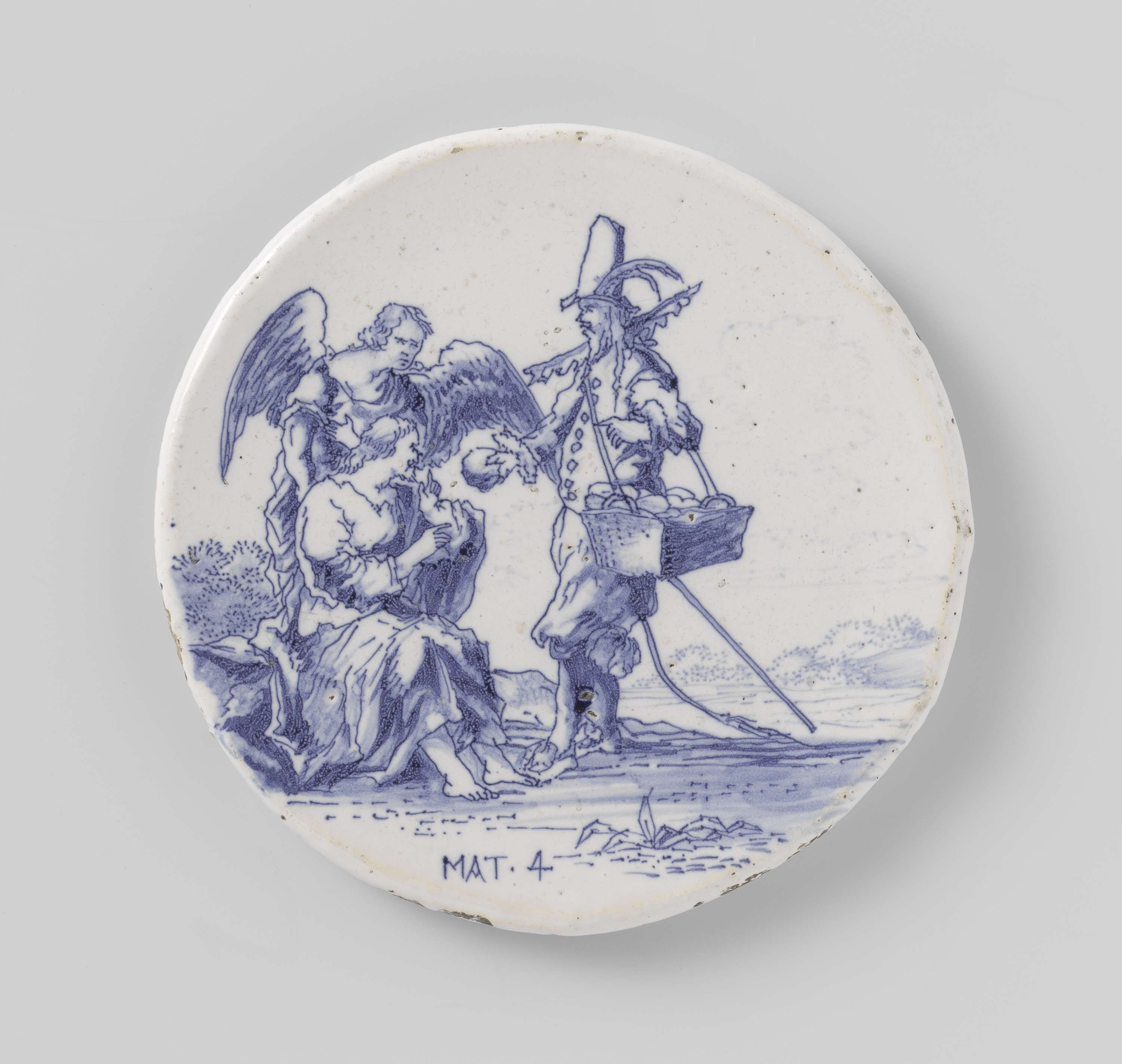 plaat van faience, beschilderd in blauw met de verzoeking in de woestijn. (Nederlands)