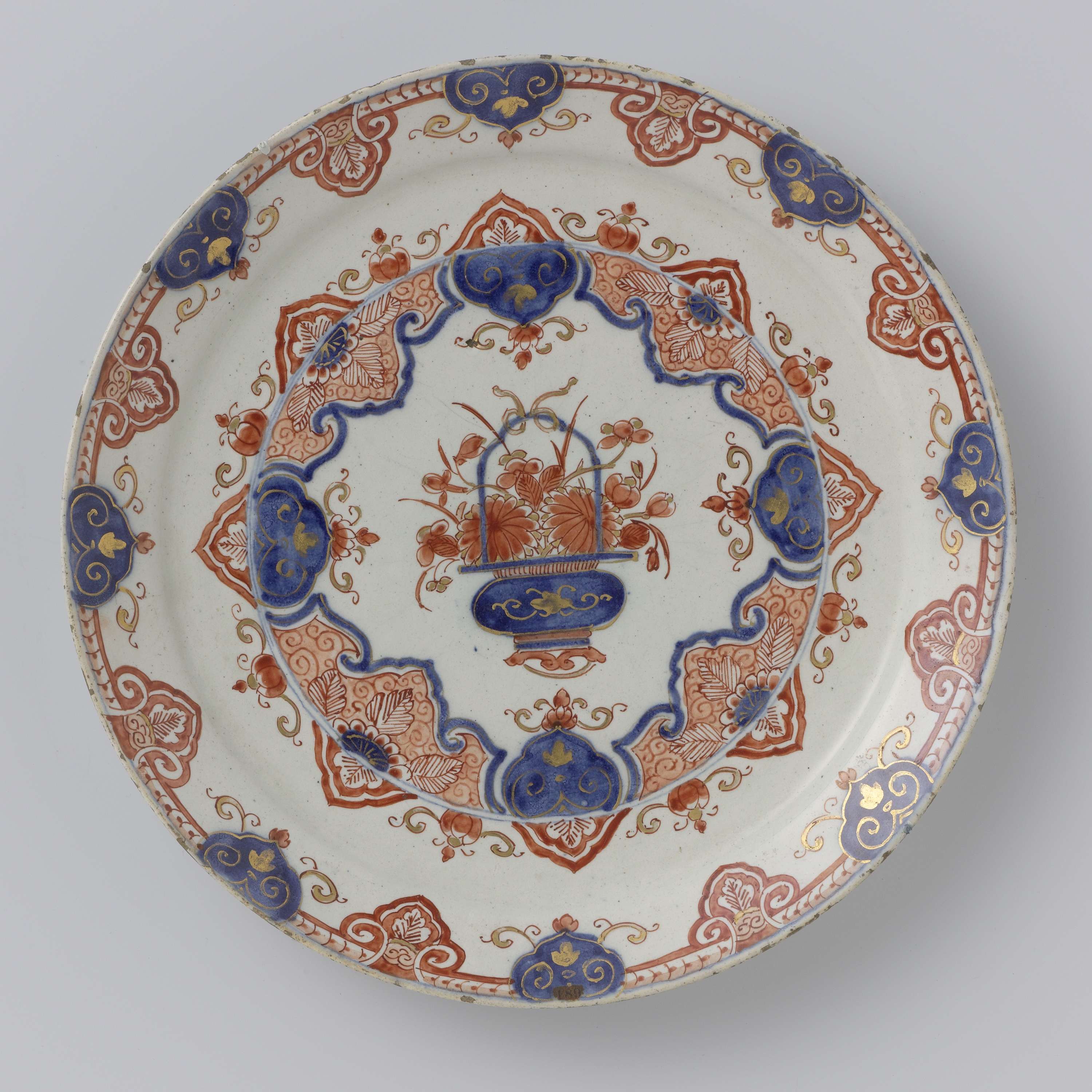 Bord van faïence. Veelkleurig beschilderd met bloemenvaas en gedecoreerde randen. (Nederlands)