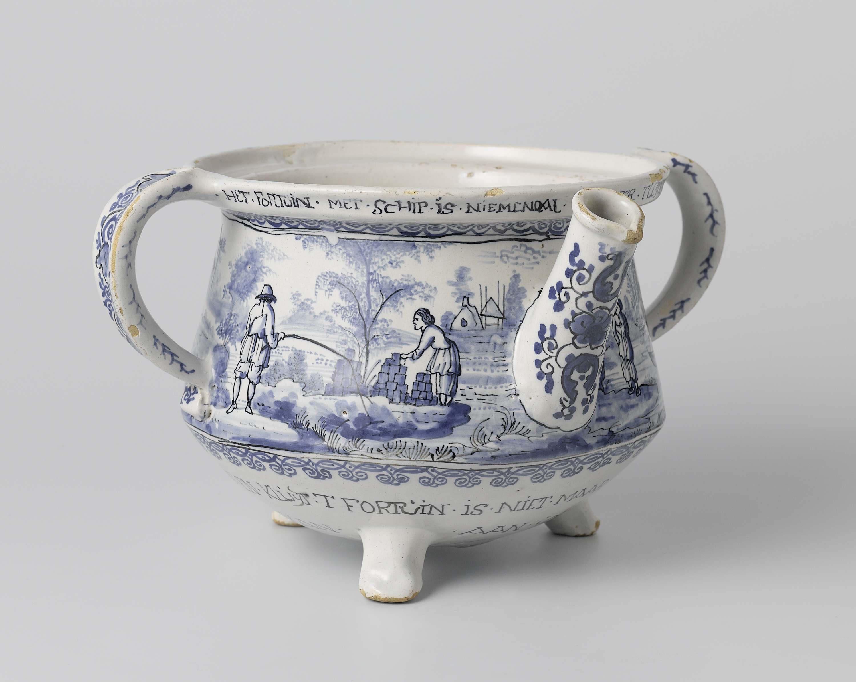Roompot van faience, beschilderd in blauw met scènes uit het turfschippersbedrijf. (Nederlands)