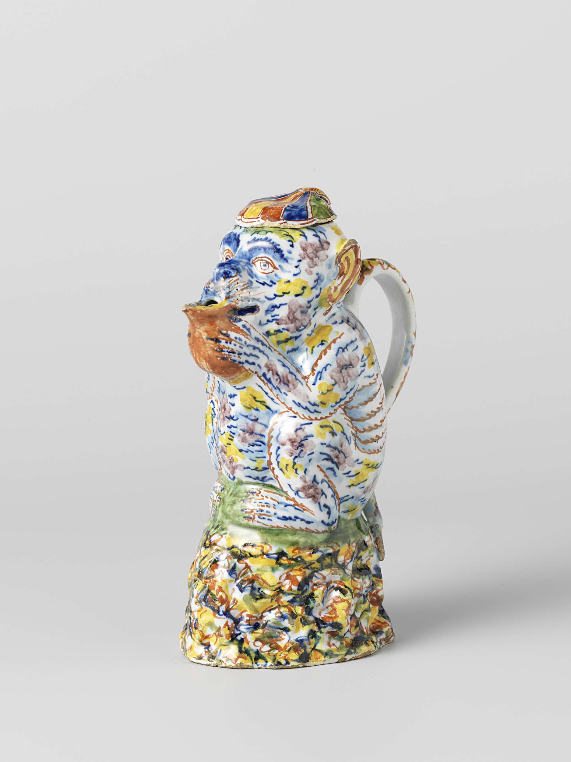 | Nederlands | Melkkan in de vorm van een aap van veelkleurig beschilderde faïence |
